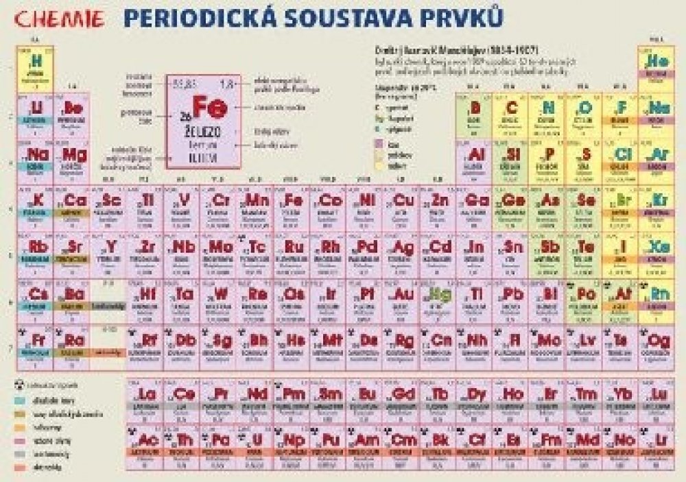 Publikace: Chemie – Periodická soustava prvků - Harvanová Lenka. Laminátová kartička určená především pro žáky základních a středních škol nabízí graficky přehledné a stručné znázornění periodické tabulky chemických prvků. U každého prvku jsou uvedeny veškeré základní údaje, tedy český i latinský název, protonové číslo, relativní atomová hmotnost, elektronegativita, oxidační čísla, ale i značka pr...