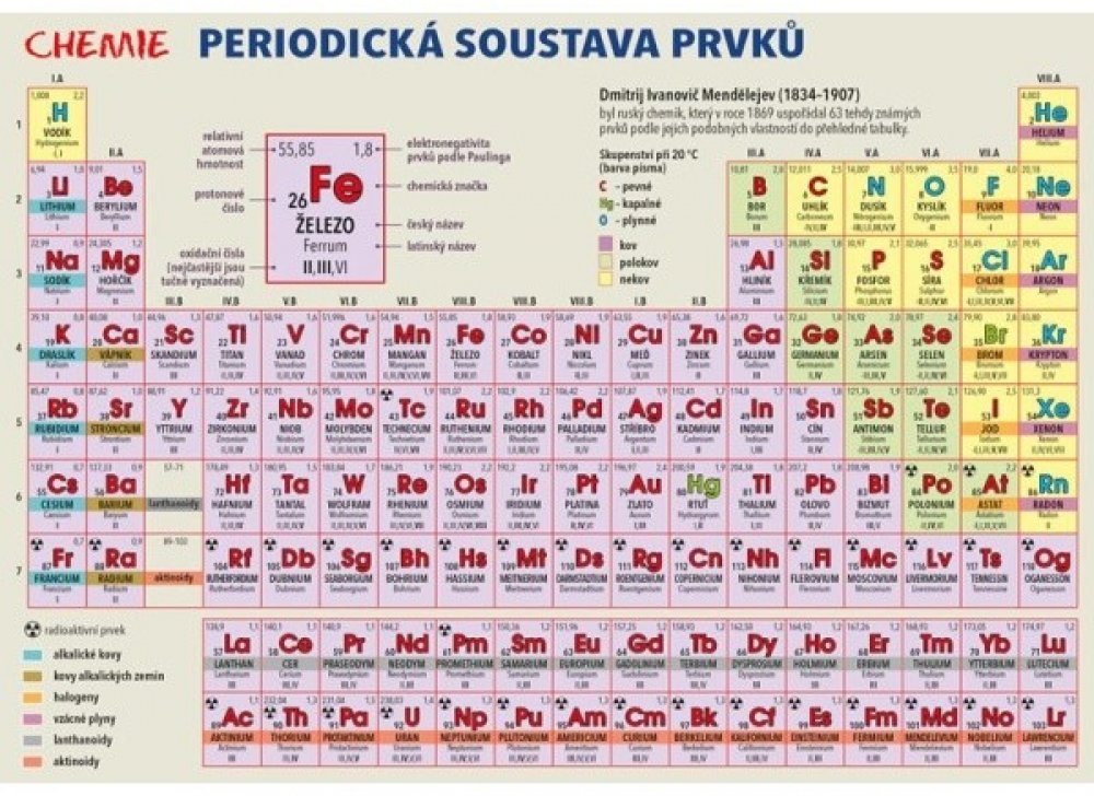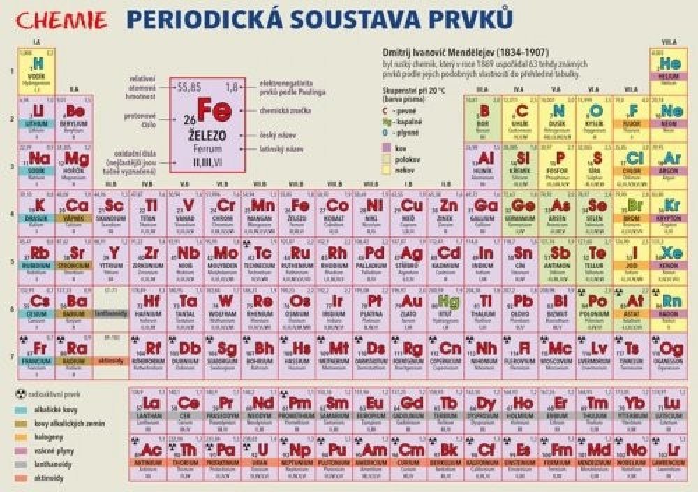 Publikace: Chemie – Periodická soustava prvků - Harvanová Lenka. Laminátová kartička určená především pro žáky základních a středních škol nabízí graficky přehledné a stručné znázornění periodické tabulky chemických prvků. U každého prvku jsou uvedeny veškeré základní údaje, tedy český i latinský název, protonové číslo, relativní atomová hmotnost, elektronegativita, oxidační čísla, ale i značka pro případnou radioaktivitu. Druhá strana kartičky nabízí přehled těch nejdůležitějších a nejužitečnějších doplňkových informací – např. koncovky oxidačních čísel, chemické vazby, veličiny, jednotky a vzorce. Publikace: Chemie – Periodická soustava prvků - Harvanová Lenka.