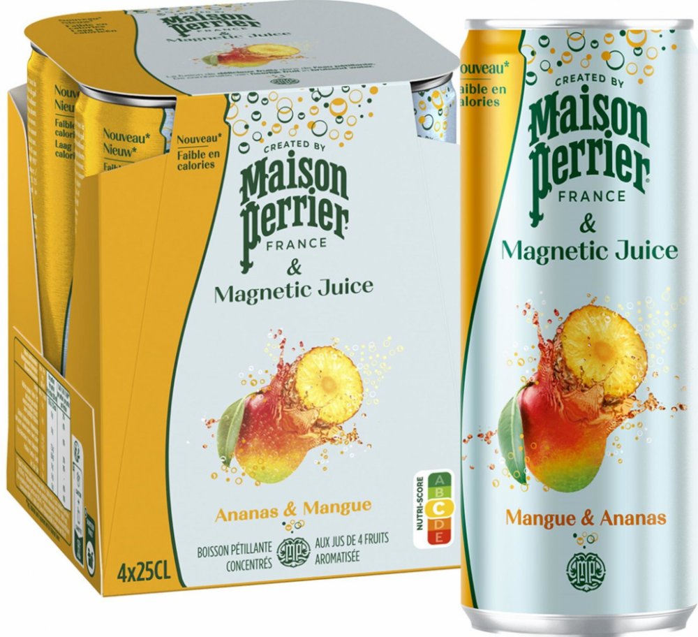 Maison Perrier Magnetic Juice 0,25l plech – Ananas & Mango, magnetická přitažlivost mezi lahodným ovocem pronikajícím do perlivé vody pro osvěžující zážitek
