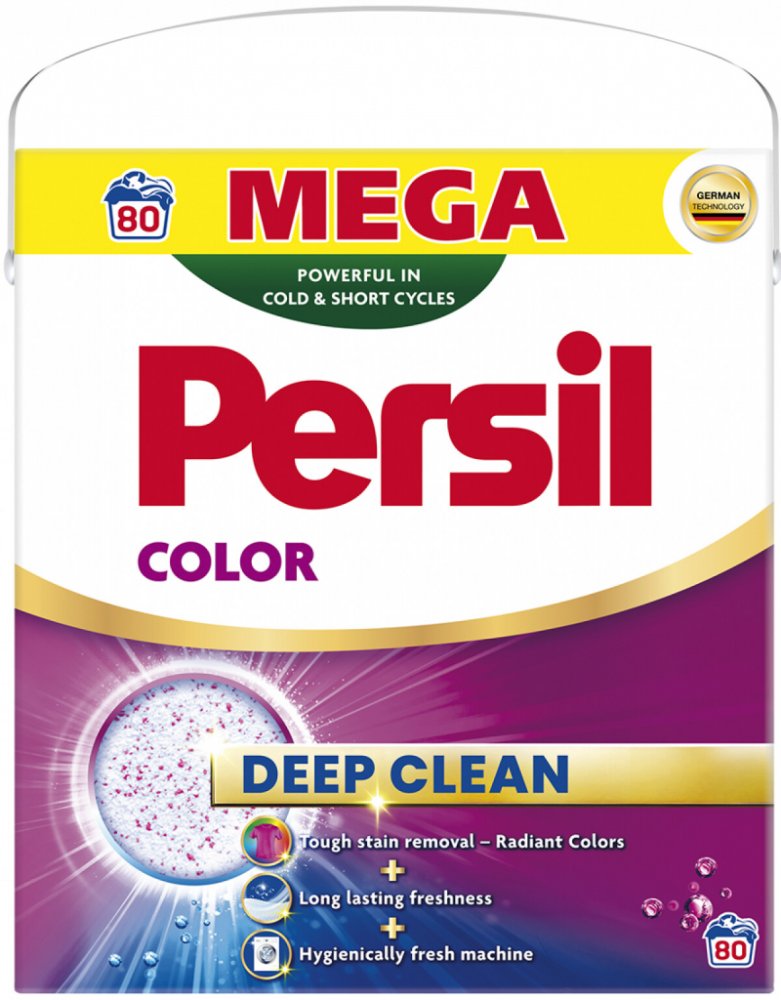 Persil prací prášek Color vám pomůže docílit dokonale čistého prádla a zářivosti barev vašeho oblečení při každém praní. Prací prášek na barevné prádlo pomáhá zachovat jas barev, zároveň poskytuje úžasný čisticí výkon a dodává pračce hygienickou svěžest díky novému složení. Technologie Deep Clean účinně odstraňuje nepříjemné pachy a poskytuje vašemu prádlu dlouhotrvající svěžest.