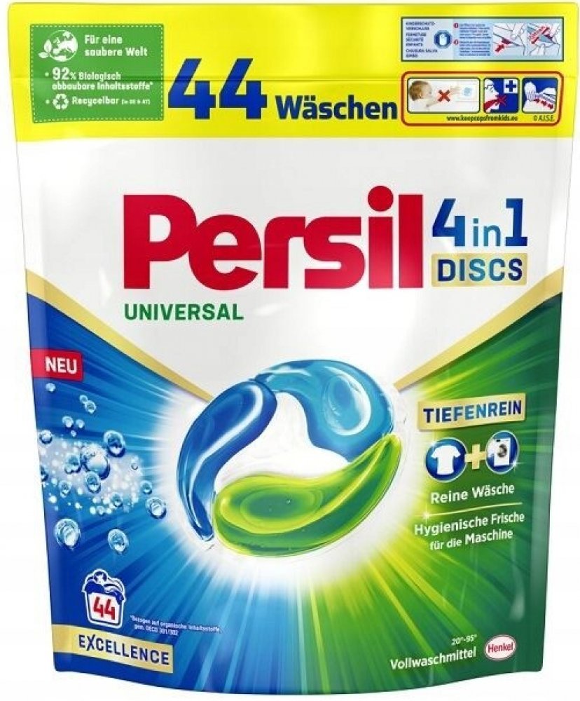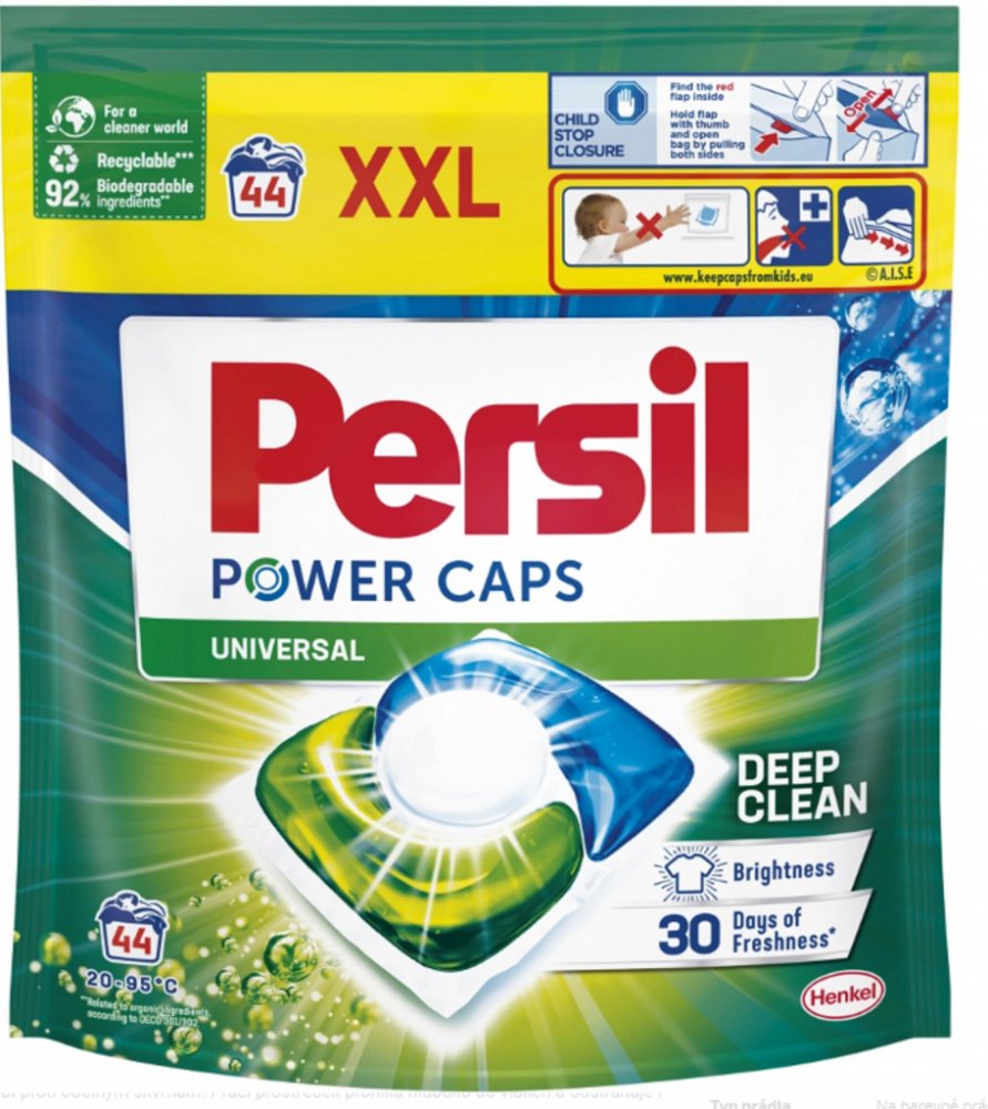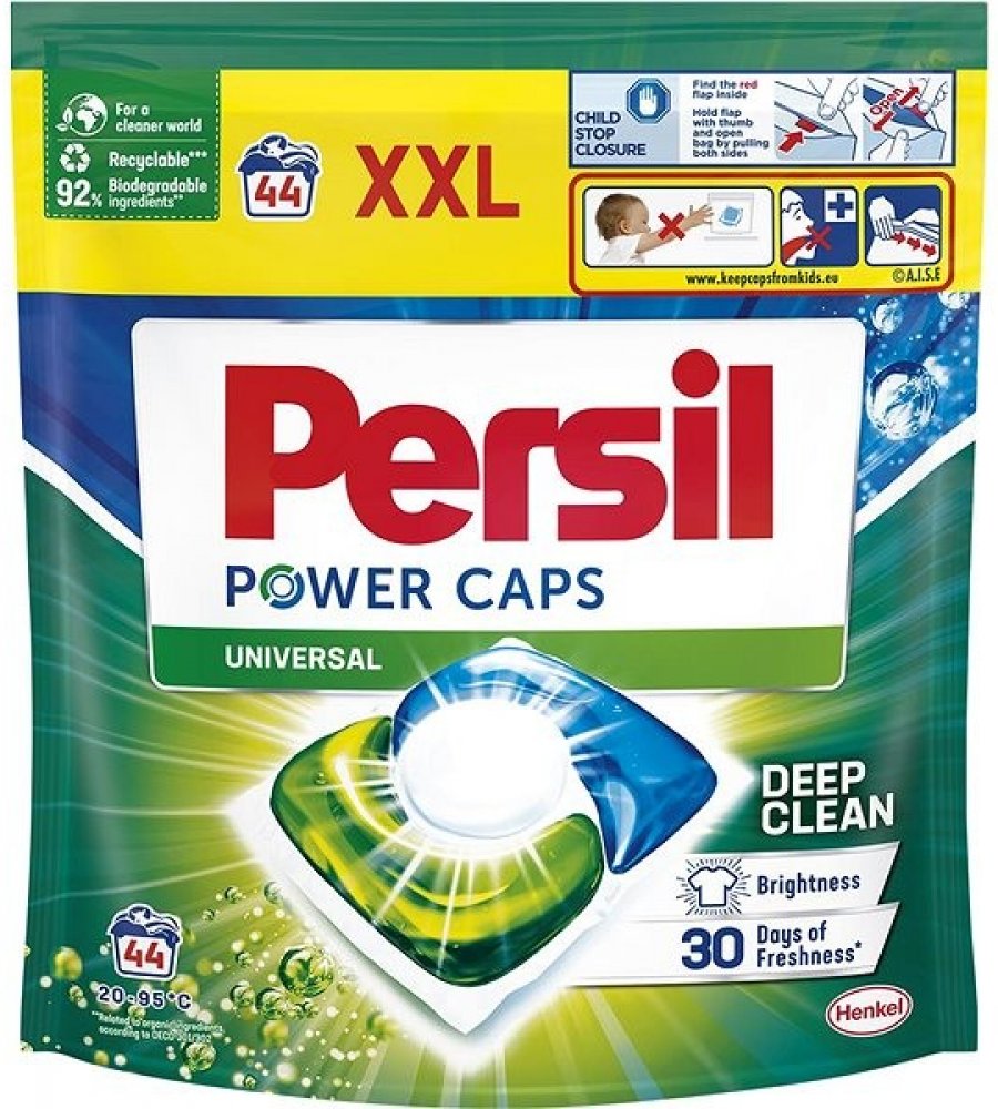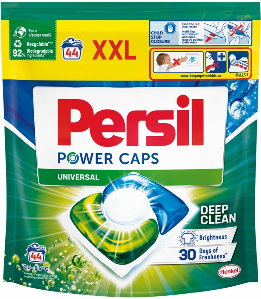 Dopřejte si dokonalou čistotu a dlouhotrvající svěžest s Persil. Kapsle jsou účinné i při nízkých teplotách (20 °C), díky čemuž můžete ušetřit za energie. Prací kapsle Power Caps Universal od značky Persil jsou šetrné i k planetě, složení obsahuje 92 % biologicky odbouratelných složek* ve 100 % recyklovatelném obalu**. *Vztahuje se na organické složky podle OECD 301/302. **Po odejmutí papírového obalu.