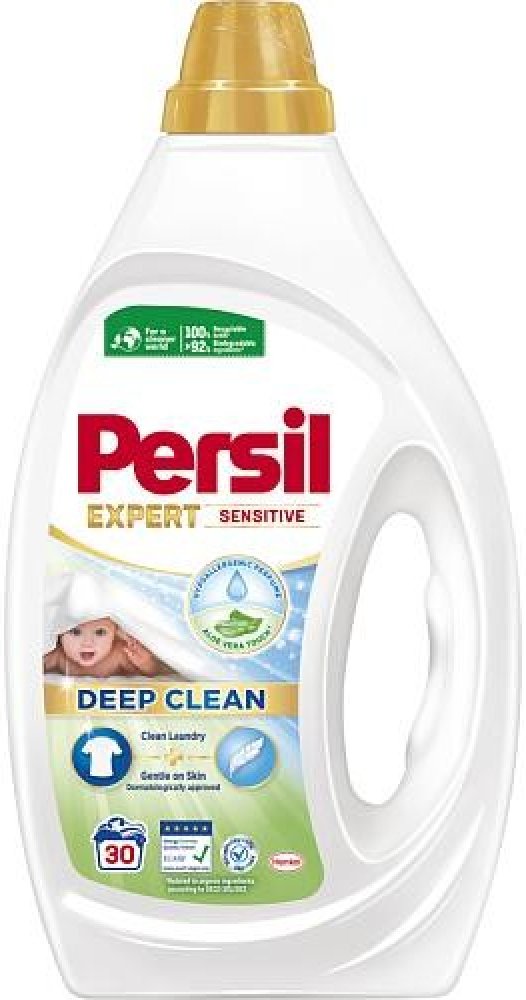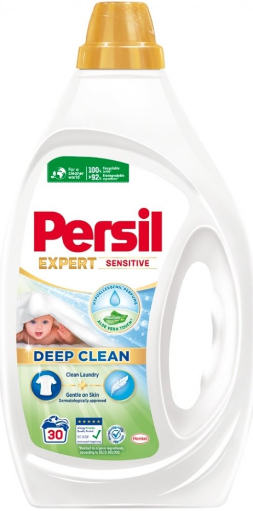 Persil Sensitive Gel efektivně odstraňuje skvrny a zároveň je šetrný k pokožce. S přírodními mýdly a lehkou vůní mandlového mléka je vhodný i pro alergiky. Testováno ECARF a ověřeno dermatology. Nyní s koncentrovanějším složením, které je šetrnější k životnímu prostředí. Tip: Pro dětské a kojenecké oblečení doporučujeme prádlo prát při maximální možné teplotě před tím, než si jej poprvé obléknou, abyste oblečení zbavili chemikálií a škodlivých látek, jež mohou tkaniny obsahovat. Klíčové vlastnosti Persil Sensitive prací gel: kvalita šetrná k alergikům a testována u ECARF schváleno dermatology účinné praní a přesto šetrný k textilu jemná a příjemná vůně přírodního mýdla a mandlového mléka na bílé a stálobarevné prádlo Použití Persil Gel Sensitive prací gel: Příklad u pračky, která pojme 4 – 5 kg prádla, běžně špinavé prádlo. 50 ml na měkkou až středně tvrdou vodu 75 ml na tvrdou až velmi tvrdou vodu nepoužívejte na praní vlněných a hedvábných textilií Složení Persil Sensitive prací gel: 5-15% aniontové povrchově aktivní látky, lt;5% neiontové povrchově aktivní látky, mýdlo, fosfonáty, optické zjasňovače, enzymy, parfém, Benzisothiazolinone, Methylisothiazolinone. Bezpečnostní upozornění GHS07 - dráždivé látky Signální slovo: Varování H319 Způsobuje vážné podráždění očí. P101 Je-li nutná lékařská pomoc, mějte po ruce obal nebo štítek výrobku. P102 Uchovávejte mimo dosah dětí. P280 Používejte ochranné rukavice/ochranný oděv/ochranné brýle/obličejový štít. P305+P351+P338 PŘI ZASAŽENÍ OČÍ: Několik minut opatrně vyplachujte vodou. Vyjměte kontaktníčočky, jsou-li nasazeny a pokud je lze vyjmout snadno. Pokračujte vevyplachování. P337+P313 Přetrvává-li podráždění očí: Vyhledejte lékařskou pomoc/ošetření.