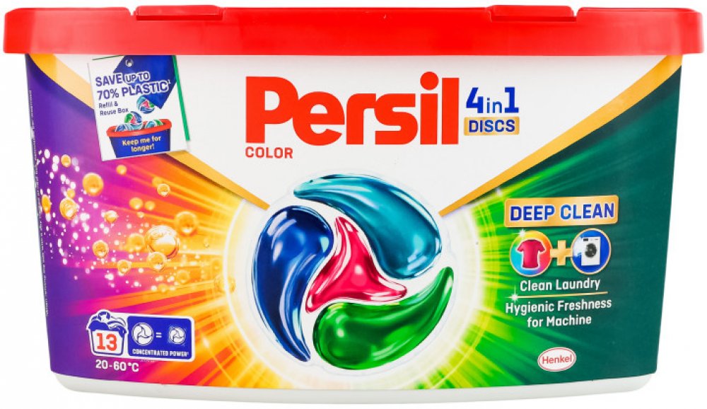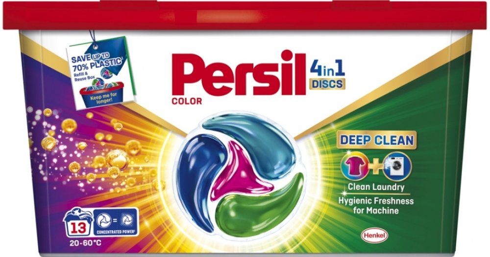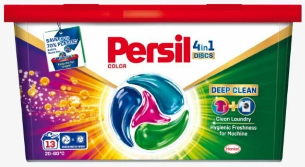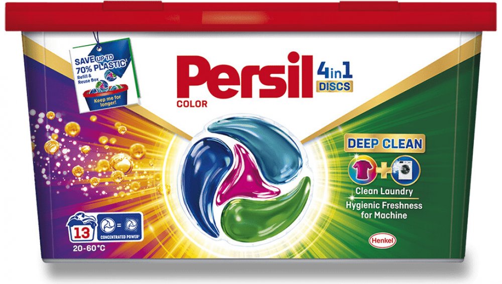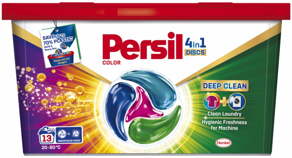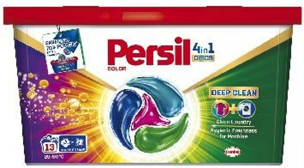 Persil kapsle 4v1 Color Deep Clean na barevné prádlo pomáhají zachovat jas barev a zároveň poskytují úžasný čisticí výkon. Navíc dodávají pračce hygienickou svěžest díky novému složení. Kapsle jsou nyní vylepšeny o technologii Deep Clean, která poskytuje hloubkové čištění prádla a hygienicky svěží pračku, kde účinně odstraňuje nepříjemné pachy. Složení těchto pracích kapslí pro barevné prádlo je navrženo tak, aby udrželo barvy zářivé a poradilo si i s těmi nejodolnějšími skvrnami. Kapsle jsou účinné i při nízkých teplotách (20 °C), díky čemuž můžete ušetřit za energie. Prací kapsle Discs 4 v 1 Color Deep Clean od značky Persil jsou šetrné i k planetě, složení obsahuje 92 % biologicky odbouratelných složek* a je vyráběno ve 100 % recyklovatelném obalu. *Vztahuje se na organické složky podle OECD 301/302. Vlastnosti kapsle Persil 4v1: koncentrovaný předdávkovaný prací prostředek na barevné prádlo pro všechny typy praček. kapsle na praní barevného prádla hloubkové vyčištění prádla pro hygienicky svěží pračku odstranění nepříjemných zápachů v pračce z 92 % biologicky rozložitelné složky Složení 15-30% neiontové povrchově aktivní látky, aniontové povrchově aktivní látky. 5-15% mýdlo. lt;5% fosfonáty. Enzymy. Parfém (hexyl cinnamal, linalool). Varování: Sáček důkladně zavřete. Nekonzumujte. Při požití vyhledejte lékařskou pomoc. Nepropichujte, neroztrhávejte nebo nerozřezávejte. Uchovávejte mimo dosah dětí. Zamezte styku s očima. Při zasažení očí důkladně oči vypláchněte vodou. Používejte se suchýma rukama. Bezpečnostní upozornění GHS07 - dráždivé látky Signální slovo: Varování EUH208 Obsahuje (viz nebezpečné látky). Může vyvolat alergickou reakci. H315 Dráždí kůži. H319 Způsobuje vážné podráždění očí. H412 Škodlivý pro vodní organismy, s dlouhodobými účinky. P101 Je-li nutná lékařská pomoc, mějte po ruce obal nebo štítek výrobku. P102 Uchovávejte mimo dosah dětí. P301+P330+P331 PŘI POŽITÍ: Vypláchněte ústa. NEVYVOLÁVEJTE zvracení. P302+P352 PŘI STYKU S KŮŽÍ: Omyjte velkým množstvím vody a mýdla P305+P351+P338 PŘI ZASAŽENÍ OČÍ: Několik minut opatrně vyplachujte vodou. Vyjměte kontaktníčočky, jsou-li nasazeny a pokud je lze vyjmout snadno. Pokračujte vevyplachování. P310 Okamžitě volejte TOXIKOLOGICKÉ INFORMAČNÍ STŘEDISKO/lékaře/ tel. 224919 293 nebo 224 915 402 (24 hodin denně) P337+P313 Přetrvává-li podráždění očí: Vyhledejte lékařskou pomoc/ošetření. P501 Odstraňte obsah/obal dle instrukcí na výrobku.