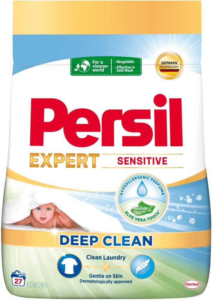 Persil Sensitive prací prášek Vám pomůže docílit perfektně čistého prádla a šetrné péče o pokožku. Prášek na praní Persil Sensitive byl vyvinut speciálně pro citlivou pokožku. Jemný prací prostředek zajistí víc než jen efektivní odstranění skvrn. Neobsahuje žádná barviva a je ideální prací prostředek na dětské nebo kojenecké oblečení. Prací prášek zajišťuje čistotu pro bílé nebo barevné prádlo, a zároveň dodává vašemu oblečení jemnou vůni. Složení bylo certifikováno institutem ECARF, aby usnadnilo každodenní život zákazníků s alergiemi. Prášek je účinný i při nízkých teplotách (20 °C), díky čemuž můžete ušetřit za energie. Prací prášek Sensitive od značky Persil je šetrný i k planetě, složení obsahuje 92 % biologicky odbouratelných složek* a je vyráběno ve 100 % recyklovatelném obalu. *Vztahuje se na organické složky podle OECD 301/302. Vlastnosti PERSIL SENSITIVE: univerzální prášek na praní hloubkové vyčištění prádla vhodné pro citlivou pokožku na dětské a kojenecké oblečení z 92 % biologicky rozložitelné složky Složení: 5-15 % aniontové povrchově aktivní látky. lt;5 % neiontové povrchově aktivní látky, zeolity, fosfonáty, polykarboxyláty. Dále obsahuje: enzymy, optické zjasňovače, parfémy. Bezpečnostní upozornění GHS07 - dráždivé látky Signální slovo: Varování H319 Způsobuje vážné podráždění očí. P101 Je-li nutná lékařská pomoc, mějte po ruce obal nebo štítek výrobku. P102 Uchovávejte mimo dosah dětí. P280 Používejte ochranné rukavice/ochranný oděv/ochranné brýle/obličejový štít. P305+P351 PŘI ZASAŽENÍ OČÍ: Několik minut opatrně oplachujte vodou. P337+P313 Přetrvává-li podráždění očí: Vyhledejte lékařskou pomoc/ošetření.