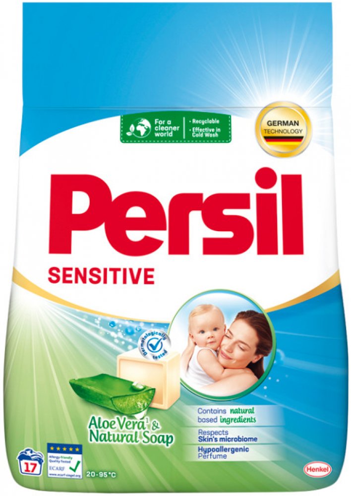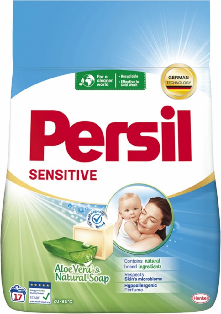 Persil Sensitive je univerzální prací prášek na bílé a barevné prádlo, vhodný pro všechny druhy praček a na ruční praní. Persil Sensitive je speciálně vyvinut pro tu nejjemnější dětskou pokožku. Neobsahuje agresivní barviva a jeho parfém byl speciálně vyvinut tak, aby nedráždil citlivou pokožku.