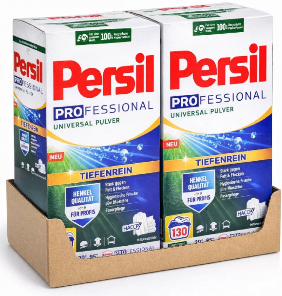 Persil Universal Professional je vysoce účinný práškový prací prostředek určený pro bílé a stálobarevné prádlo. Díky speciálním enzymům si hravě poradí i s odolnými skvrnami od jídla, trávy nebo potu. Zanechává prádlo hygienicky čisté, krásně voňavé a svěží. Obsahuje aktivní látky proti šednutí textilu, takže vaše prádlo bude i po opakovaném praní vypadat jako nové. Vhodný je jak pro domácnosti s větší spotřebou, tak pro menší penziony či provozovny, které hledají spolehlivé řešení německé kvality.