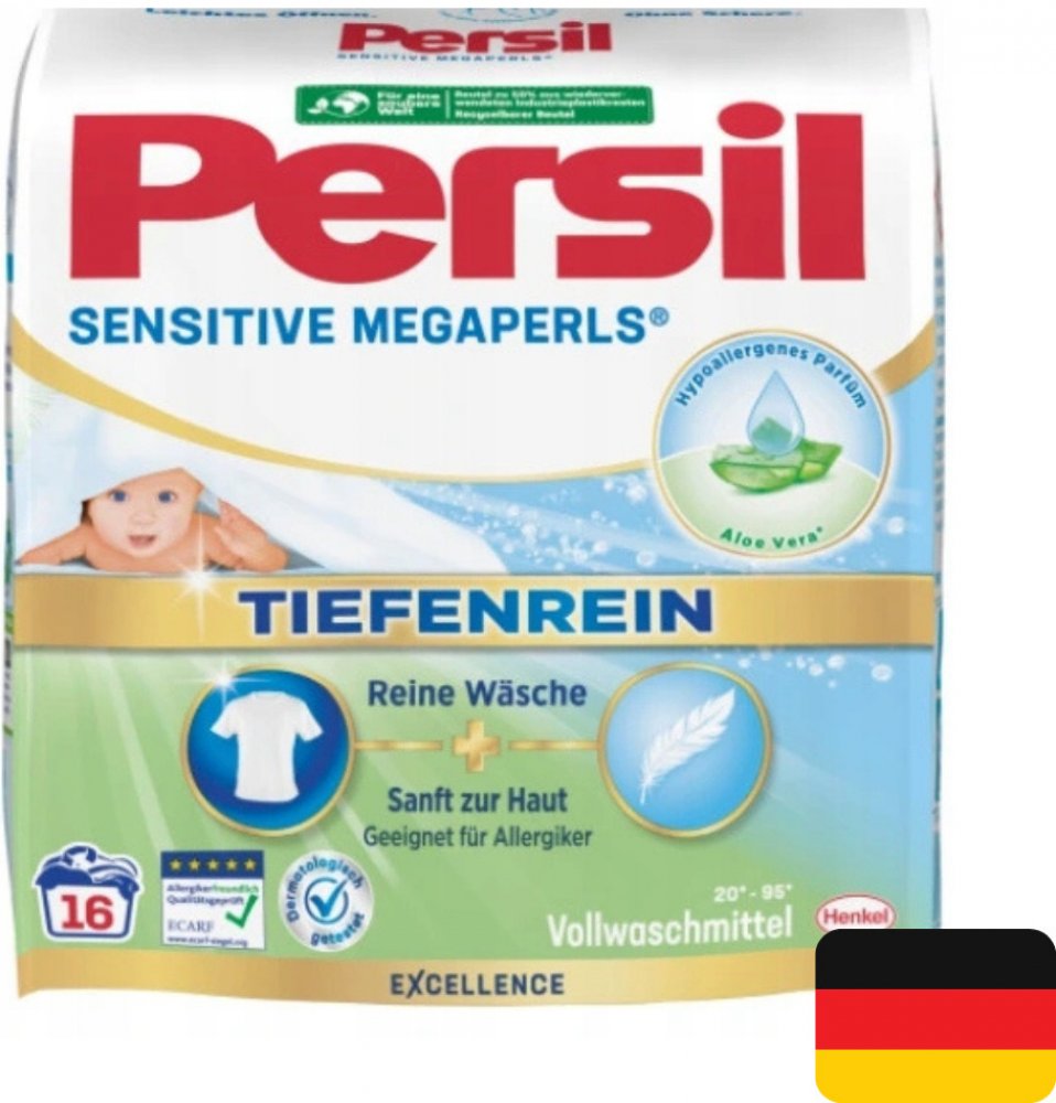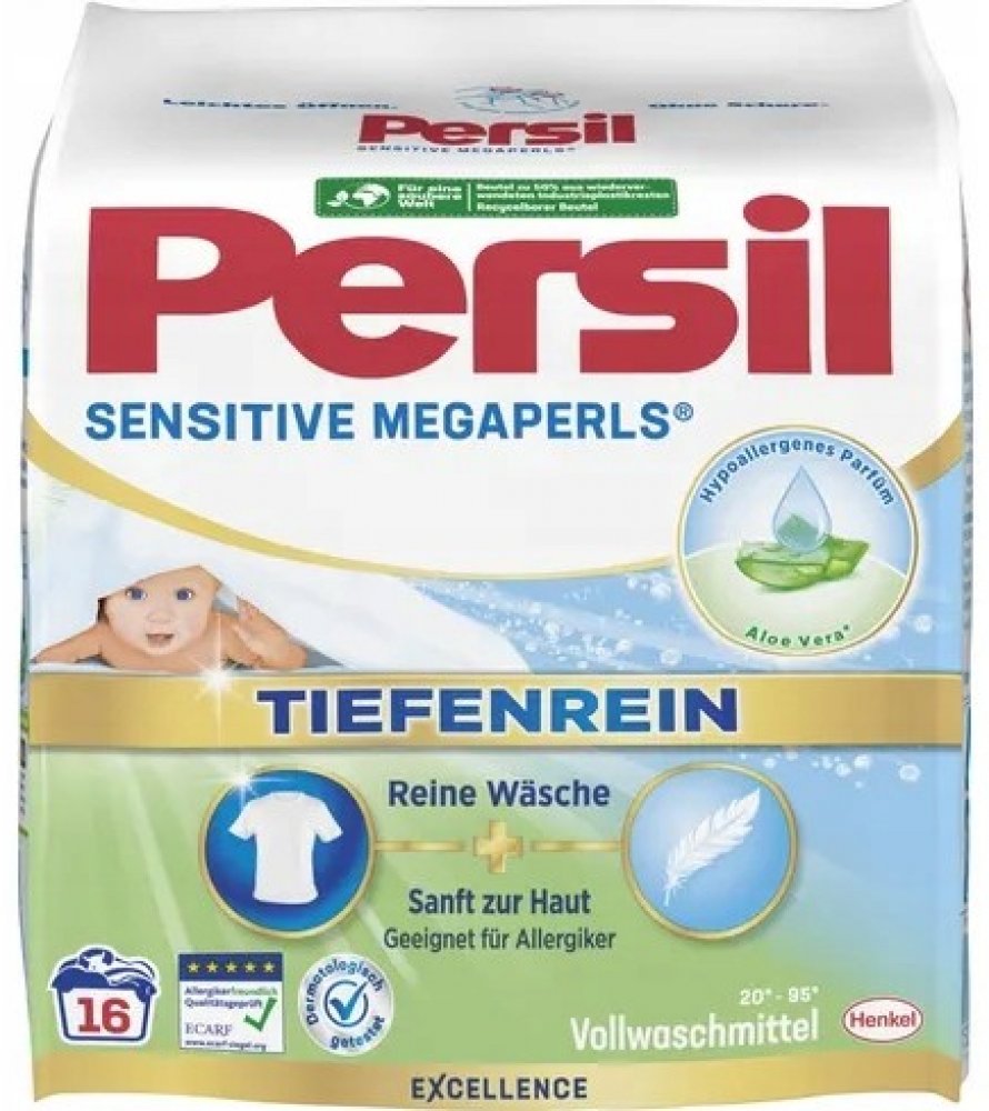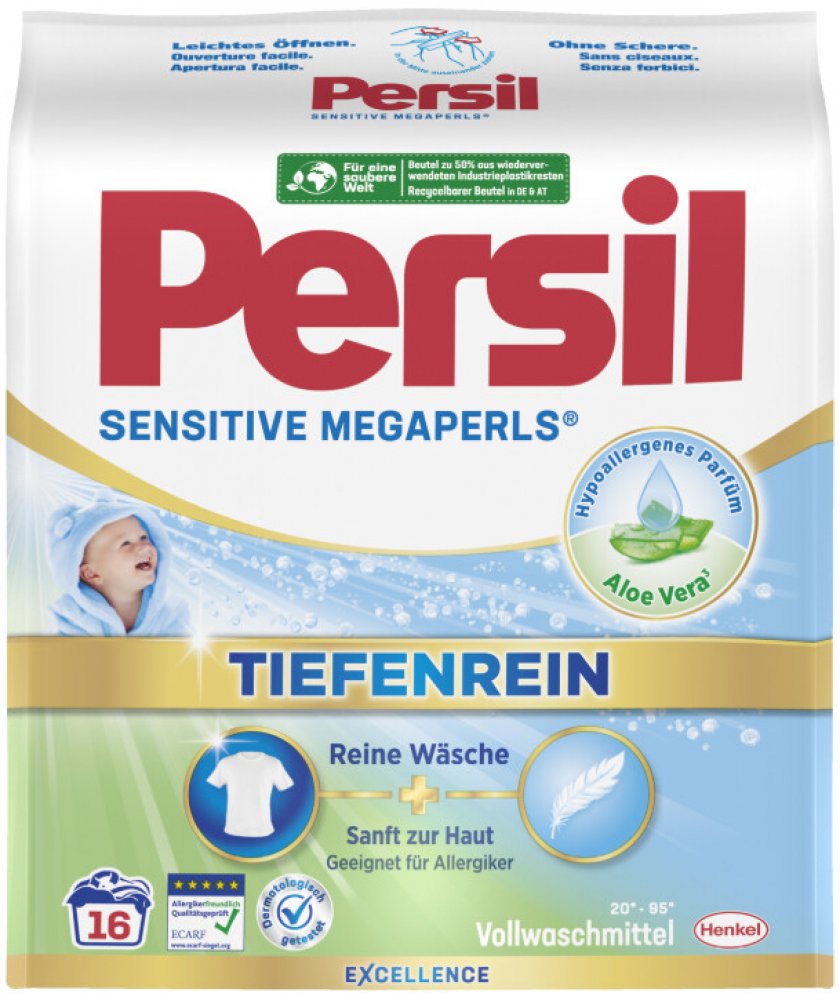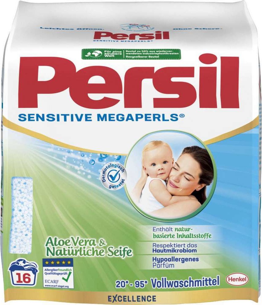 Německý Persil Sensitive Megaperls prací prášek byl speciálně vyvinut pro tu nejjemnější dětskou pokožku. Vhodné pro bílé i barevné prádlo. Jeho kvality jsou potvrzeny certifikátem institutu ECARF (Evropské centrum pro výzkum alergií), který výrobky dermatologicky testoval. Vhodné pro alergiky a osoby s citlivou pokožkou. Vůně byla speciálně vyvinuta tak, aby nedráždila citlivou pokožku. Receptura Persil Sensitive megaperls je obohacena přírodní mýdlo, aloe vera. Respektuje kožní mikrobiom. Speciální formule Persil působí velmi účinně i při nízkých teplotách. Vhodný pro praní od 20° do 95 °C. Pro krásně zářivé a čisté prádlo každý den. Vyvinutému s dermatology. POUŽITÍ:Nasypte prášek do dávkovače na prací prostředek nebo přímo do bubnu pračky dle dávkování. SLOŽENÍ:viz ingredients (Inhaltsstoffangabe) na boční straně výrobku.DOVOZ:NĚMECKO.UPOZORNĚNÍ:Způsobuje vážné podráždění očí. Uchovávejte mimo dosah dětí. Při zasažení očí: Několik minut opatrně vyplachujte vodou. Vyjměte kontaktní čočky, jsou-li nasazeny a pokud je lze vyjmout snadno. Pokračujte ve vyplachování. Přetrvává-li podráždění očí: Vyhledejte lékařskou pomoc/ošetření. Při požití: Necítíte-li se dobře, volejte toxikologické informační středisko/lékaře. Je-li nutná lékařská pomoc, mějte po ruce obal nebo štítek výrobku. Může vyvolat alergickou reakci.ŽIVOTNÍ PROSTŘEDÍ:Neodhazujte výrobek ani prázdný obal do volné přírody. Chraňte životní prostředí tříděním odpadu.VÝROBCE:HENKEL AG & Co. KGaAHenkelstrasse 67D-40589 DüsseldorfTel: +49 0800 111 2290www.henkel.de