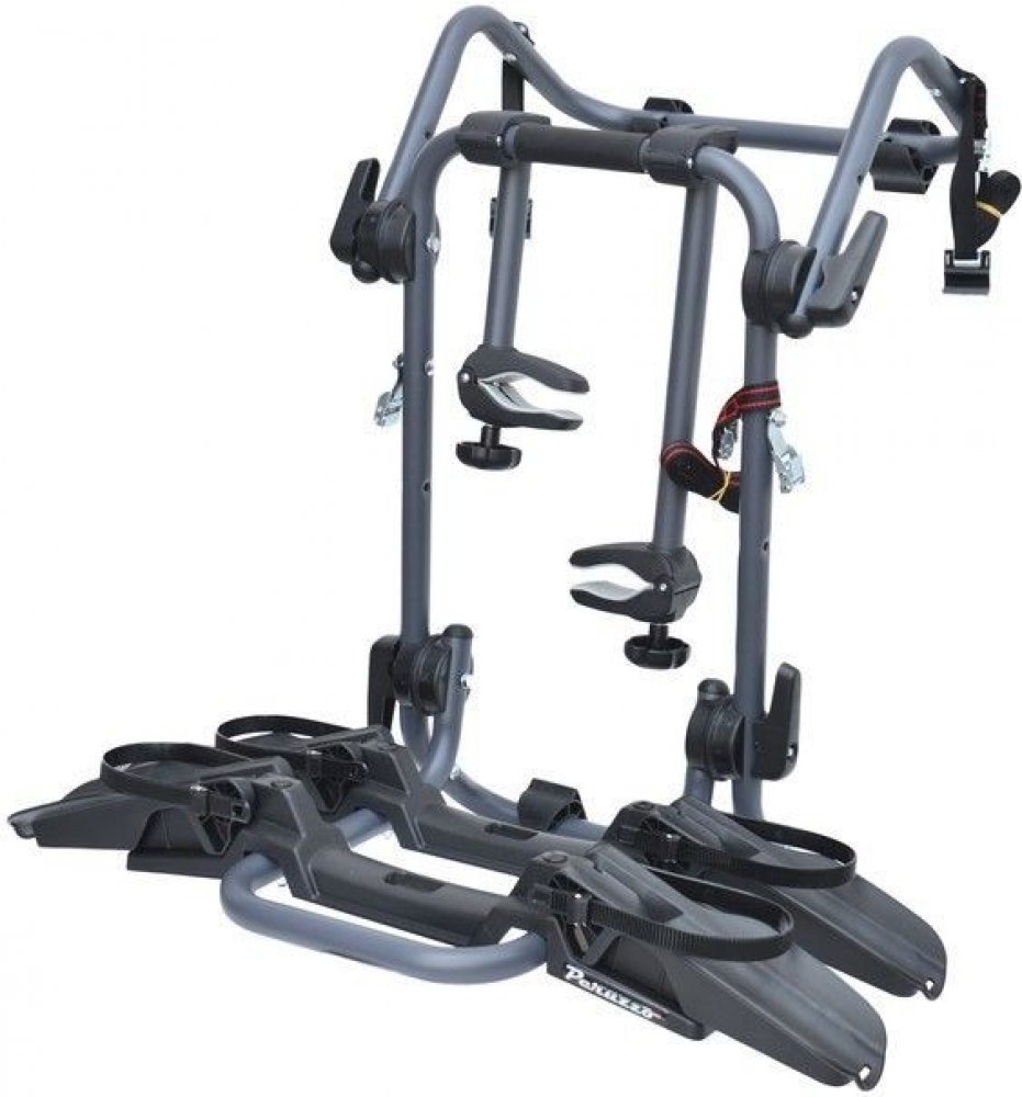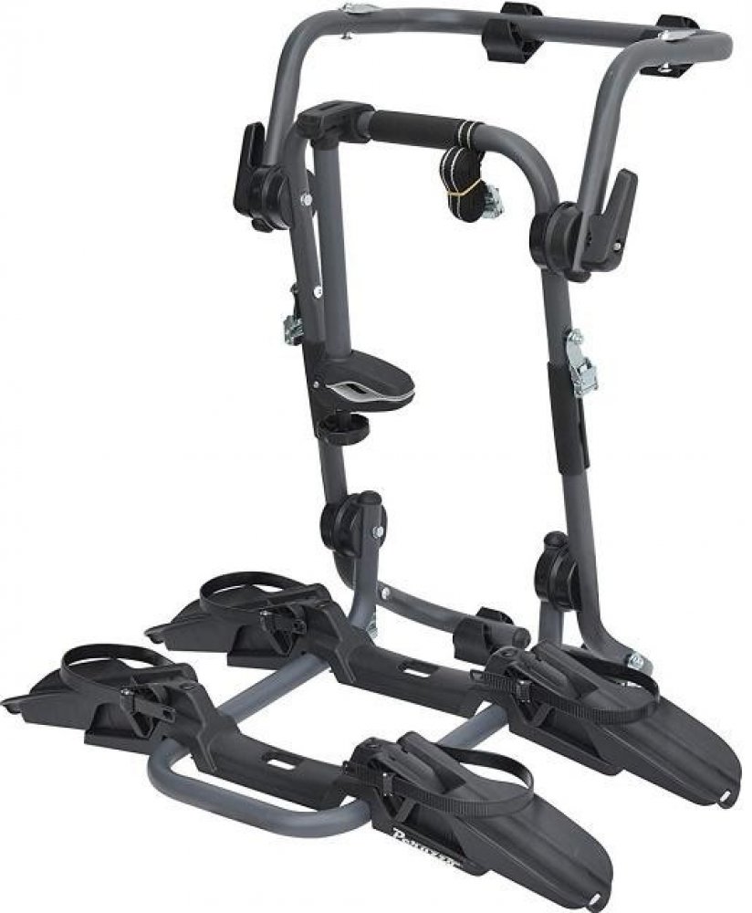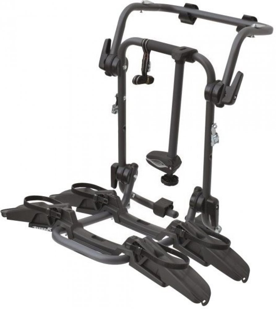 Nosič pro 2 jízdní kola, k upevnění na 5. dveře automobilu. Upevňuje se pomocí pásků a je kompatibilní s většinou vozů - i sedany. • Nosič pro 2 jízdní kola, k upevnění na 5. dveře automobilu