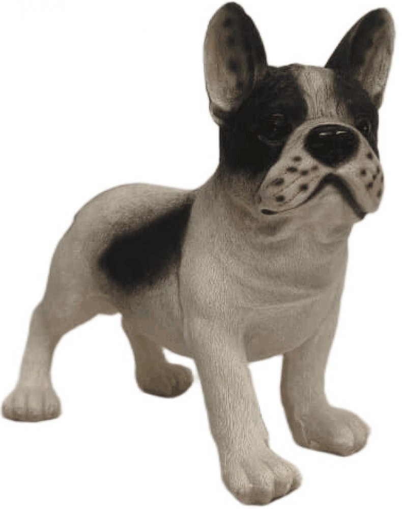 Pes francouzský buldoček. Hravý, přátelský, sebevědomý pes, netopýří uši, krátký nos. Bytová, zahradní dekorace, dekorace do dětského pokoje, inspiruje jejich představivost a zvědavost o zvířatech. Skvělý dárek pro každého milovníka psů. Výška 27 cm, délka 33 cm, šířka 14 cm. Materiál polyston.