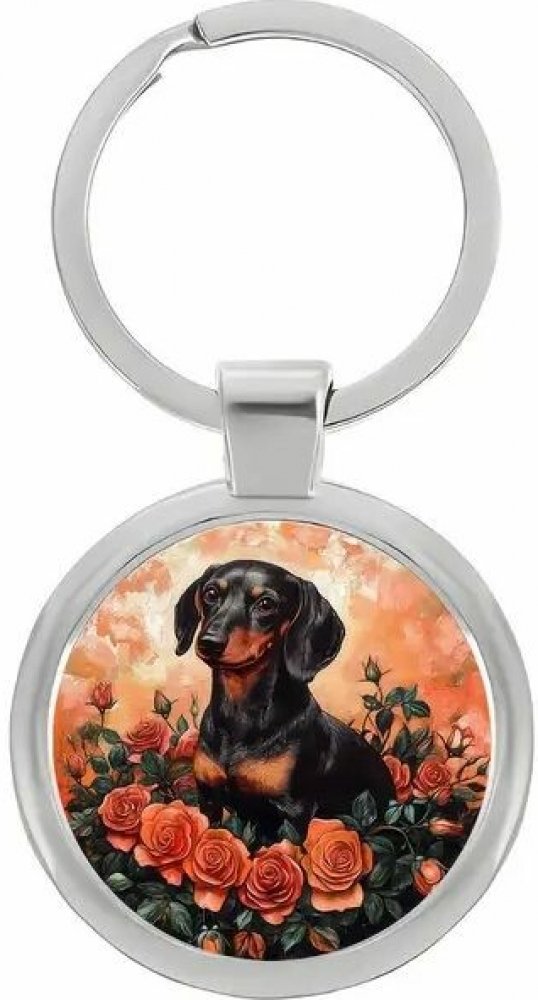 Stylový přívěsek na klíče se psem - jezevčíkem. Na přívěsku je roztomilý jezevčík s růžemi. Klíčenka s populárním plemenem jezevčík je vhodná pro všechny milovníky psů.