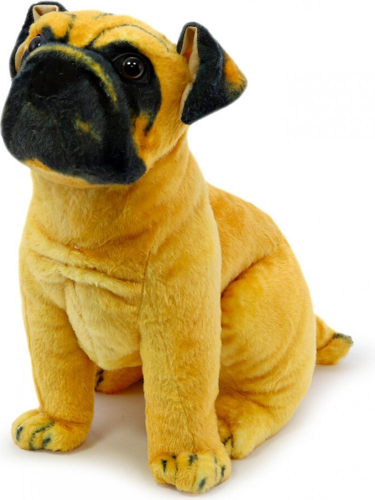 Na tomto plemeni milujeme především jeho roztomile bojovný pohled. Ten dohromady se štěněcí neohrabaností dodává živému i našemu plyšovému mopsíkovi neodolatelný vzhled. Náš plyšový mops sedí a zvědavě vzhlíží ke svému malému páníčkovi. Od skutečného psíka je k nerozeznání díky dokonalým rysům, propracované něžné srsti, barvě, vrásčitému čenichu i přesným proporcím. Na rozdíl od skutečného psa, plyšový mopsík vás nebude trápit svými nároky na hygienu. Jeho povrch stačí otřít vlhkým hadříkem a může se zabydlet tam, kde to má každý mops nejradši. V dětské postýlce.