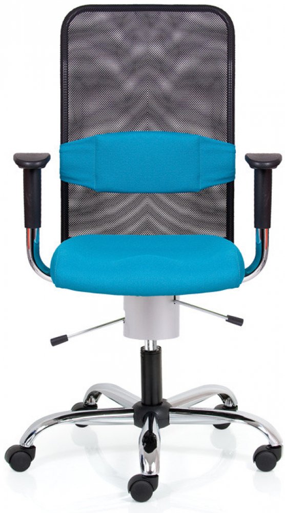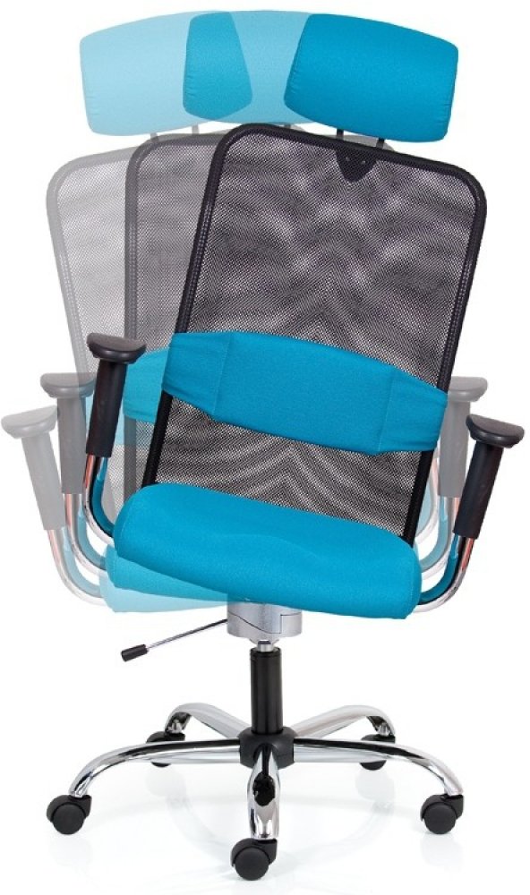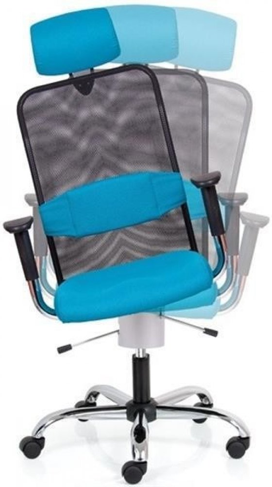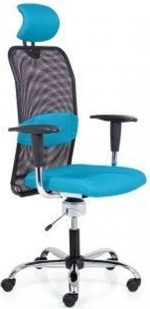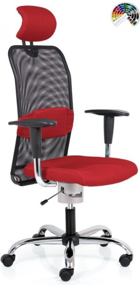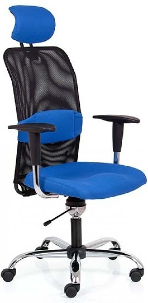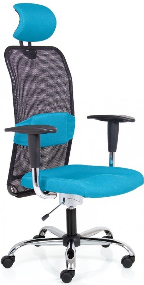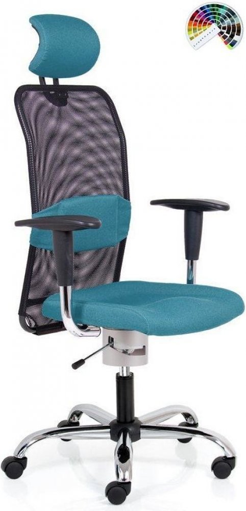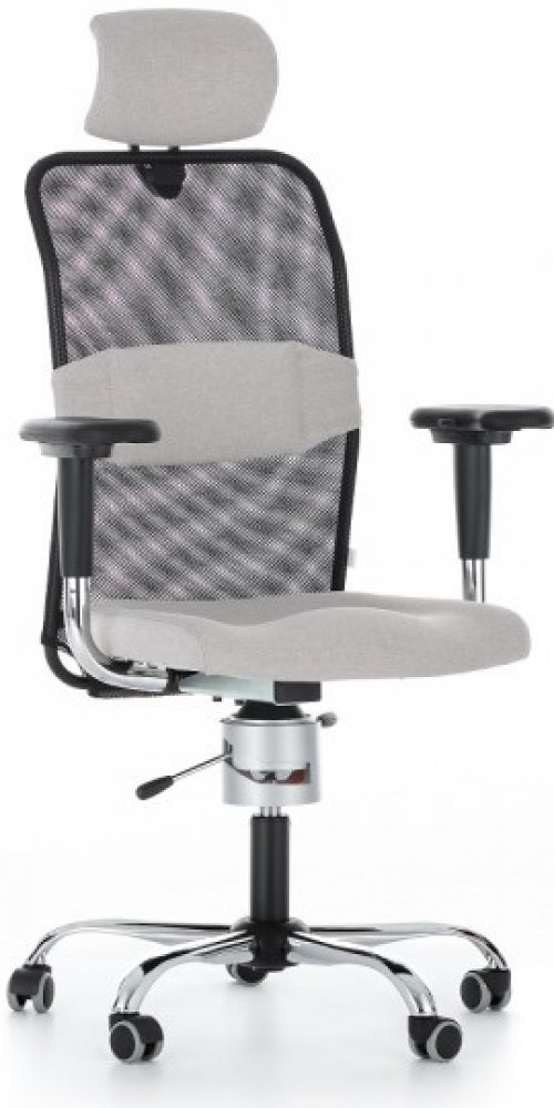 Židle se skládá z kříže, koleček, opěráku, sedáku, područek a opěrky hlavy. Součástí chromovaného kříže je pět koleček zajišťujících mobilitu židle po prostoru. Kolečka jsou vhodná na koberce. Ergonomicky tvarovaný opěrák má kovovou konstrukci potaženou samonosnou černou prodyšnou síťovinou. Sedák je čalouněný materiálem a barvou dle Vašeho výběru. Dále bederní opěrka s možností výškového nastavení. Také područky jsou výškově nastavitelné, zajistí oporu rukou při pracování, protože šíjové a zádové svalstvo je odlehčené. Židle má navíc opěrku hlavy.