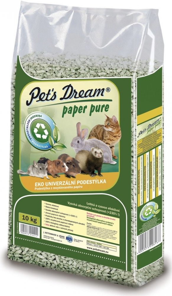 Pet’s Dream Paper pure 10 kg - Vysoce absorpční stelivo pro domácí mazlíčky z recyklovaných papírových vláken. Balení 10 kg. - Komfortní stelivo s vysokou absorpční schopností pro domácí mazlíčky. Podestýlka ve formě pelet z recyklovaných papírových vláken. Ekologické a kompostovatelné stelivo vhodné pro kočky, zakrslé králíky, morčata, křečky a další hlodavce.