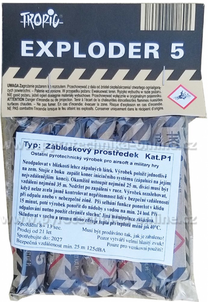 Petarda Exploder 5 se zapaluje pomoci knotu na petardě. Petardu Exploder 5 je nutno házet do dálky. Po pěti až třinácti vteřinách nasleduje silná hlasitá exploze se zábleskem.