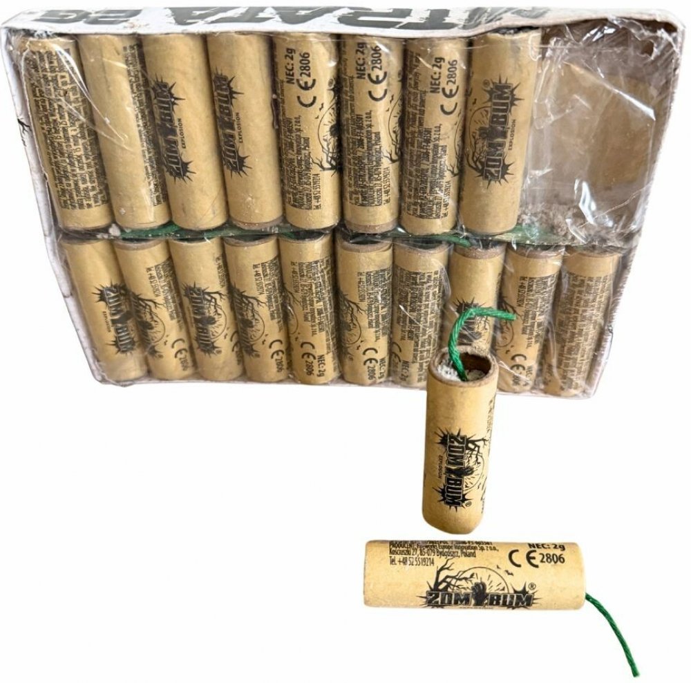 Petardy ZOM BUM nitrata 2G se řadí do 3. kategorie a jsou prodejné od 21 let. Petardy ZOM BUM nitrata 2G před samotnou explozí nevydávají žádný světelný efekt. Balení obsahuje 20 kusů petard ZOM BUM nitrata 2G. Jedná se o novinku roku 2025.
