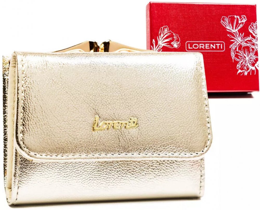 - Malá kožená peněženka ve zlaté barvě pro ženy. Peněženka má přihrádku na bankovky, vnější kapsu na mince se zapínáním na sponu a průhledný slot na karty. RFID-STOP membrána. Baleno v dárkové krabičce.