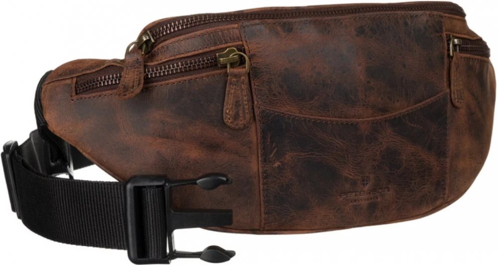 Zaoblená pánská kožená ledvinka Peterson, která spojuje praktičnost s osobitým stylem. Hlavní kapsa na zip nabízí dostatek prostoru pro vše potřebné, zatímco na přední straně najdete dvě malé boční kapsičky na zip - perfektní na drobnosti. Střed přední části zdobí elegantní logo Peterson, které dodává ledvince charakter. Na zadní straně je ukrytá další zipová kapsa pro bezpečné uložení cenností. Textilní popruh je pohodlný, snadno nastavitelný a díky sponě ho můžete i rozepnout. Mosazné kování doplňuje celkový design a dodává mu jemný vintage nádech. Objednejte ještě dnes a vyzkoušejte, vrátit ji můžete až za 30 dnů!