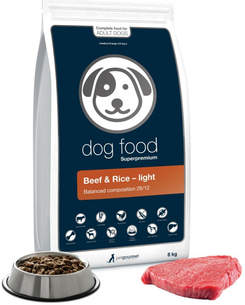 Kompletní krmivo se sníženým obsahem tuku pro psy středních a velkých plemen (od 10 kg) po kastraci, s nadváhou a minimem pohybu, starší psy – hovězí maso s rýží.