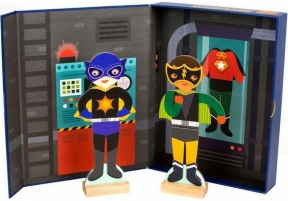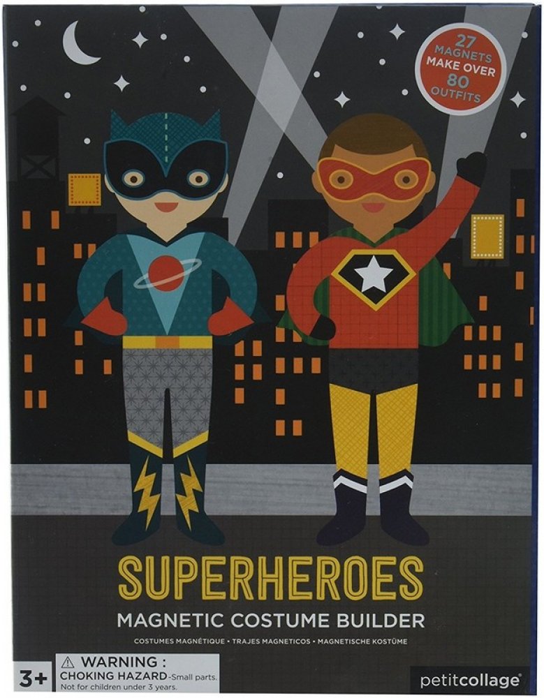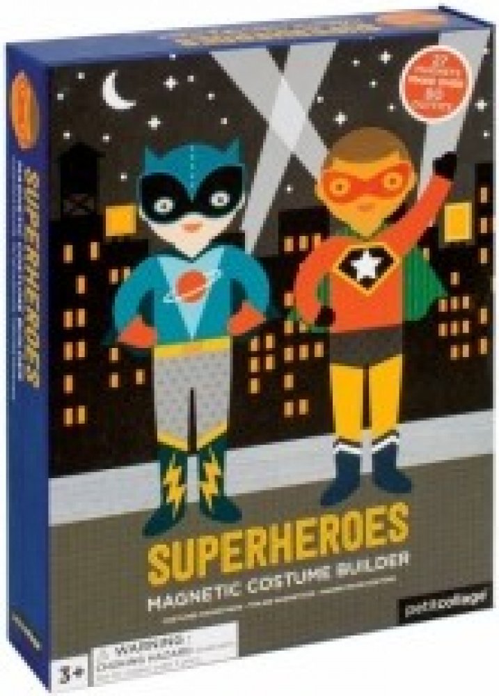 Puzzle Petitcollage s 27 ks magnetických kousků oblečení pro superhrdiny. Děti mohou superhrdinům poskládat až 80 různých variant super převleků a zachránit tak celý svět díky úžasným příběhům, které je napadnou. Děti mohou kombinovat jak spodní, tak horní díly, ale také doplňky. Sada obsahuje 2 velké superhrdiny a 2 stojánky.