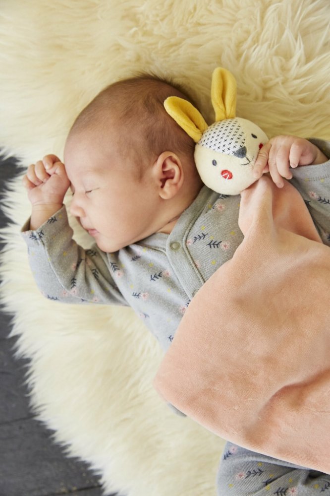 Extra měkká, plyšová dečka s hlavou usměvavého králíčka. Perfektní na poobědový odpočinek. Kontrastní vzory a barvy králíčka podněcují u dětí rozvoj senzoriky, uzlíček na rohu dečky zase mohou držet nebo kousat.