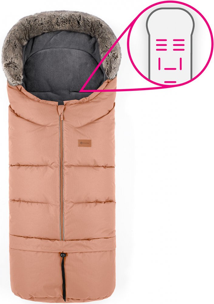 - 4v1 – odepnutím spodní části změníte velikost fusaku na menší, který se hodí i do vaničky nebo autosedačky, a připevněním kožešinky – získáte ochranu proti větru.