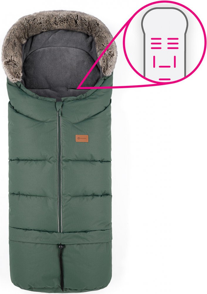 - 4v1 – odepnutím spodní části změníte velikost fusaku na menší, který se hodí i do vaničky nebo autosedačky, a připevněním kožešinky – získáte ochranu proti větru.