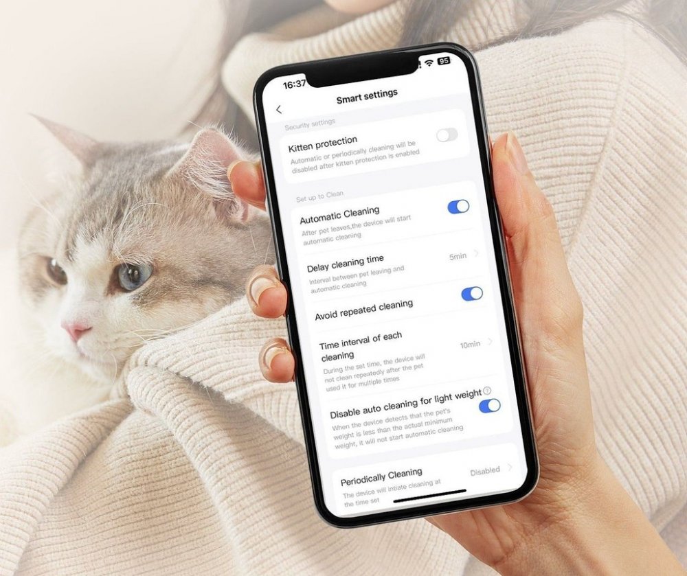 Box na stelivo je vybaven přehledným LED displejem a tlačítky pro jednoduché ovládání. Zařízení můžete také přidat do aplikace PetKit a ovládat jej na dálku - i když jste mimo domov, například na cestě na dovolenou. Zapínejte a vypínejte zařízení Pura X, zobrazujte statistiky a dostávejte oznámení v reálném čase o tom, jak často vaše kočka stelivo používá, a dokonce i o jeho hmotnosti.