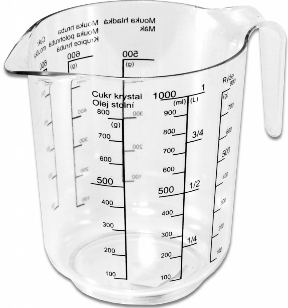 Odměrka 1L je opatřena stupnicí na mouku hrubou, polohrubou a hladkou, rýži, cukr moučku, cukr krystal, mák, olej a vodu.