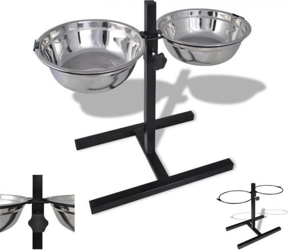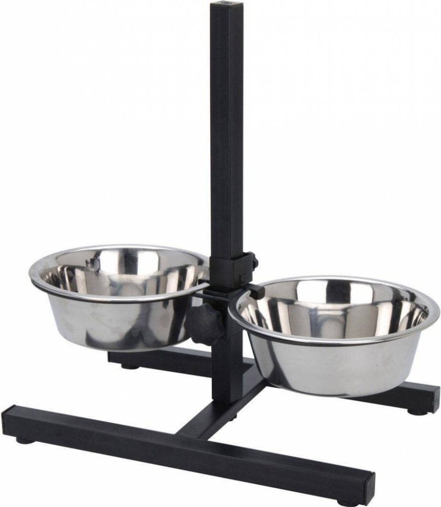 Materiál: nerez, kov Rozměry: miska 2 x 1,8 l, průměr 19 cm, hloubka 7 cm, stojan 40 x 37,5 x 46,5 cm Detaily: - Dvě misky pro psy na stojanu s nastavitelnou výškou (od podlahy 8- 40 cm) .- Misky z nerezové oceli, kovový stojánek pokrytý černou práškovou barvou.- Vybaveny protiskluzovými nožičkami.- Ochrana proti vyjmutí misky psem.- Pevné kroužky podpírající misky.- Sada je určena pro střední a v...