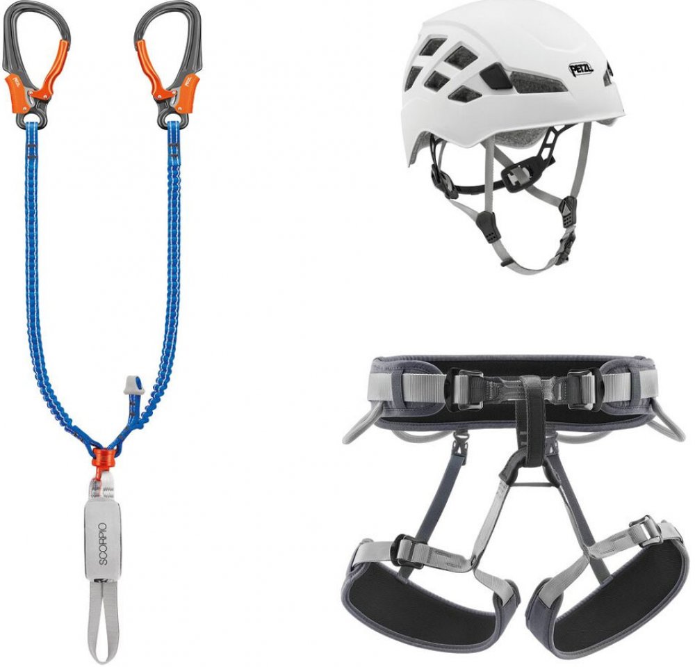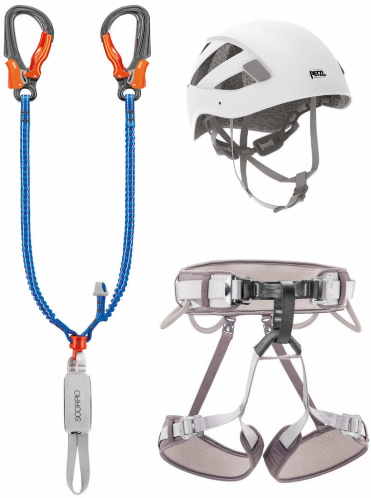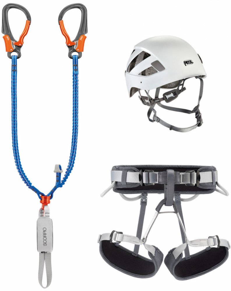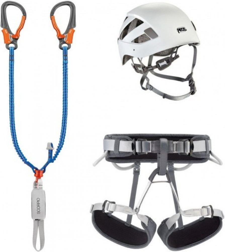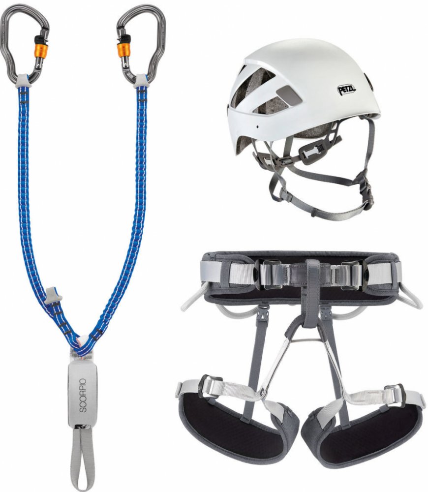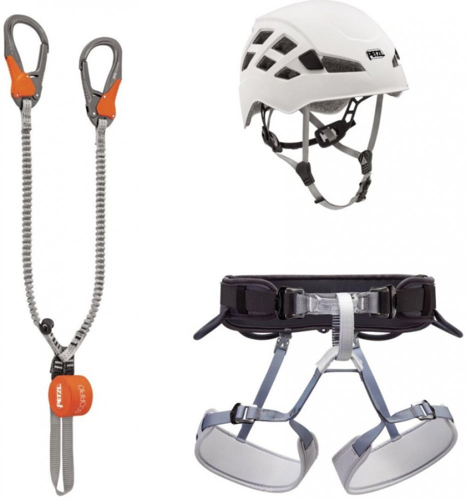 Ferratový balík Petzl Kit Via Ferrata Vertigo se základním vybavením na zajištěné cesty. Set obsahuje tlumič pádu Petzl Scorpio Vertigo, nastavitelný sedací úvazek Corax a přilbu Boreal.