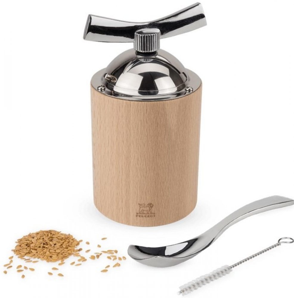 Lněná semínka jsou superpotraviny známé pro své zdraví prospěšné účinky. Jediná podmínka, jak využít všech jejich výhod: rozemlít je. Mlýnek na lněné semínko Peugeot je skutečnou inovací. Mechanismus tohoto mlýnku je speciálně navržen pro mletí semen, přizpůsobuje se jejich konzistenci a tvrdosti. Jeho mechanismus lze zcela demontovat pro rychlé a dokonalé čištění. Jeho design, který kombinuje nerezovou ocel a dřevo (z lesů Franche-Comté), z něj dělá nádherný nástroj. Mlýnek je dodáván s nerezovou lžičkou (dávka 5 g) a čisticím kartáčkem. Vychutnejte si čerstvě namletá lněná semínka na vašich polévkách, salátech apod.
