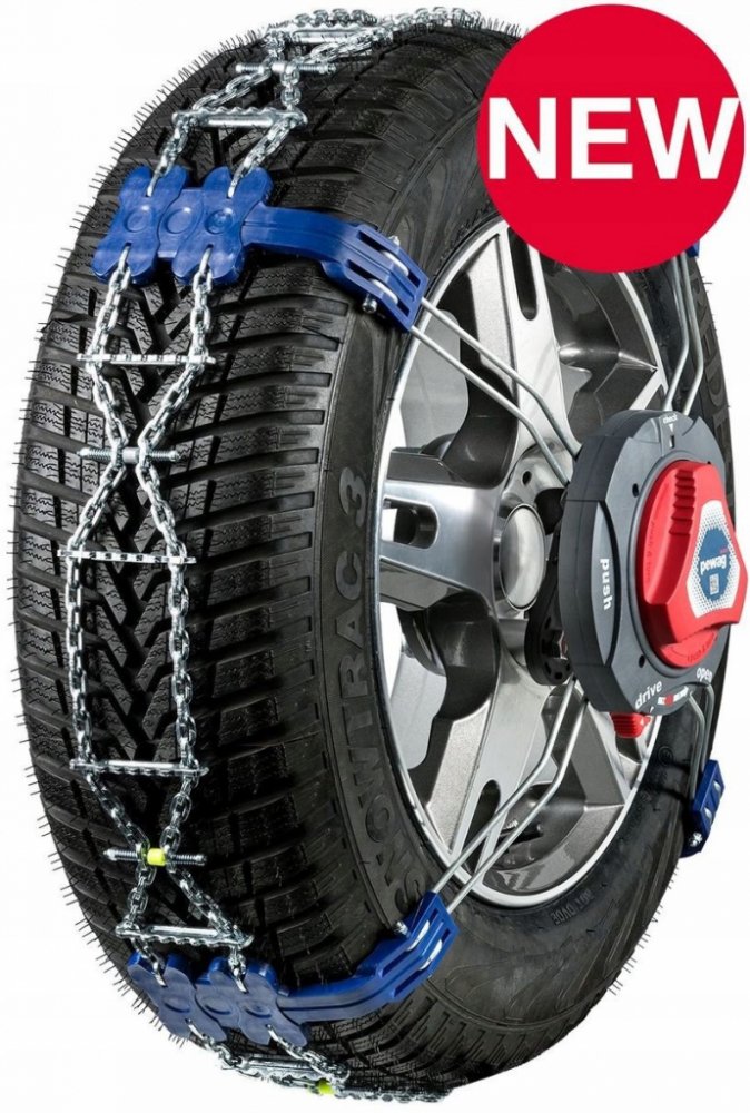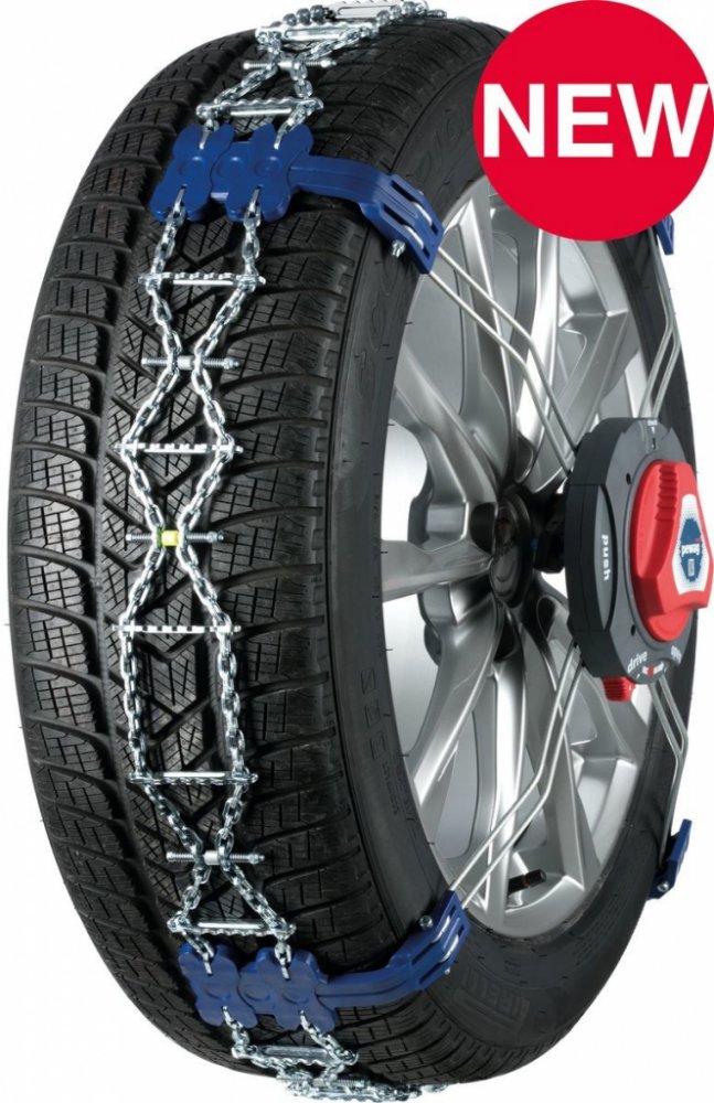 Inovativní pewag nasazovací systém s automatickou servo ráčnou. Řešení pro vozidla kde není dostatek prostoru pro standardní sněhové řetězy.