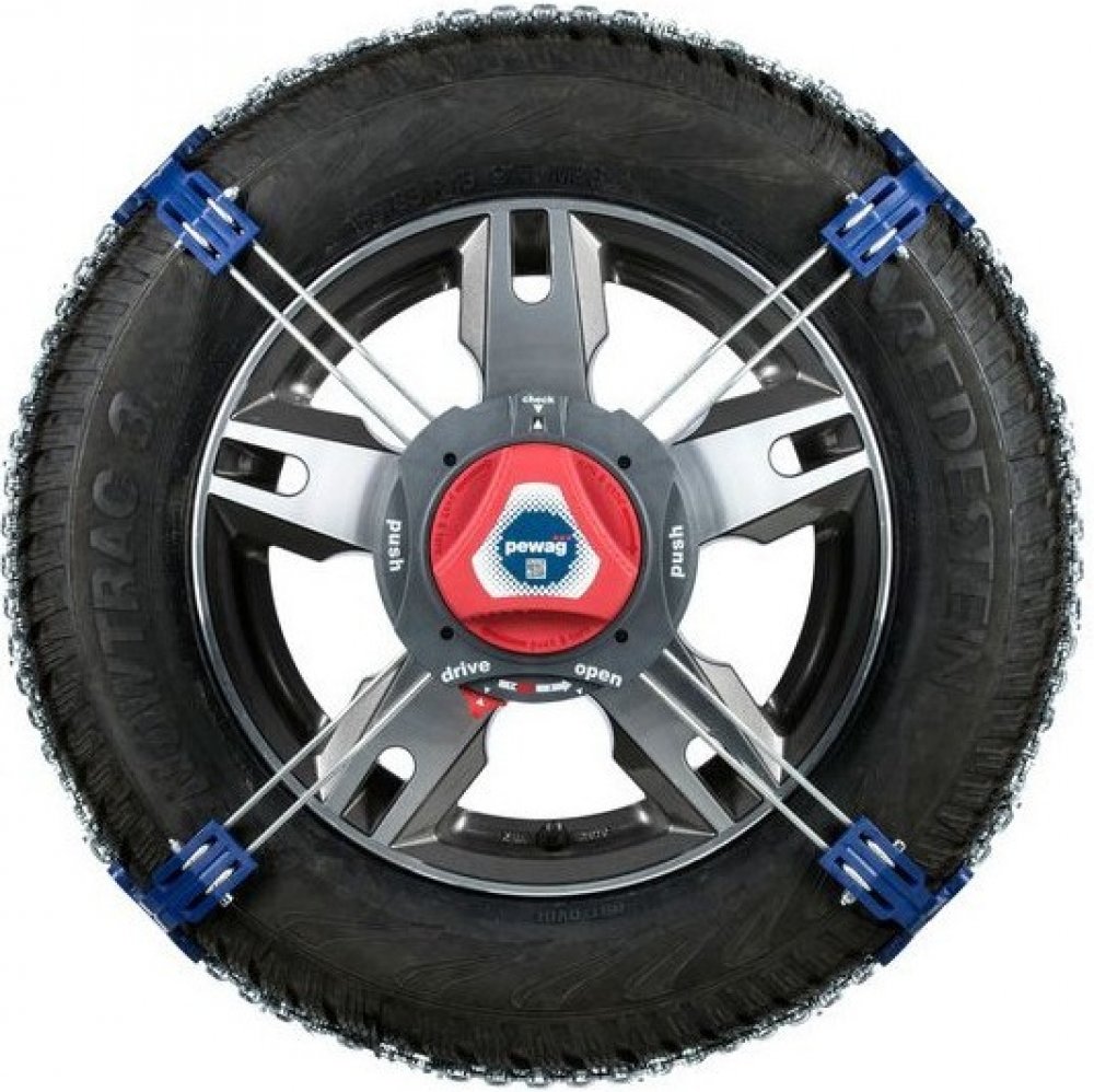 Inovativní pewag nasazovací systém s automatickou servo ráčnou. Řešení pro vozidla kde není dostatek prostoru pro standardní sněhové řetězy.