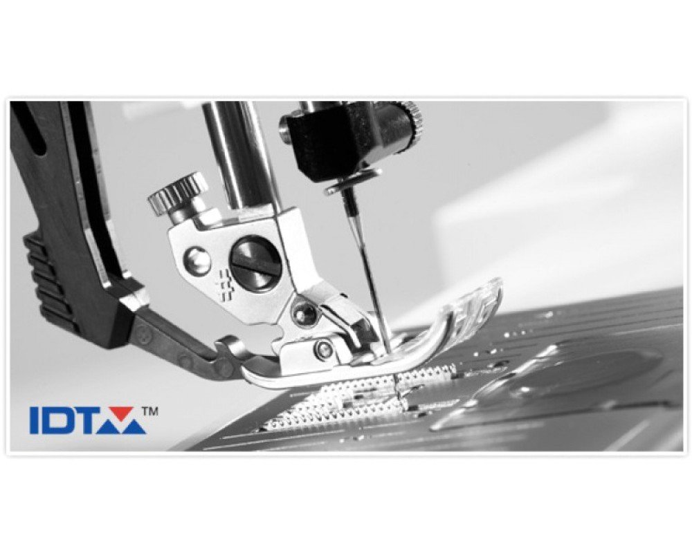 - Systém horního podávání IDT - pro dokonalé podávání horní i spodní látky. Neocenitelná funkce pro šití lehkých i silných materiálů ve více vrstvách - zajišťuje rovnoměrné podávání materiálů vč. problémových i ve více vrstvách. Z toho důvodu je stroj vhodný i pro šití patchworku, šití kabelek atd. Lze používat silnější nitě jak na běžných šicích strojích.