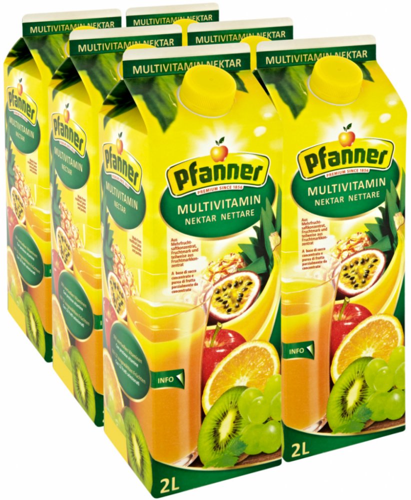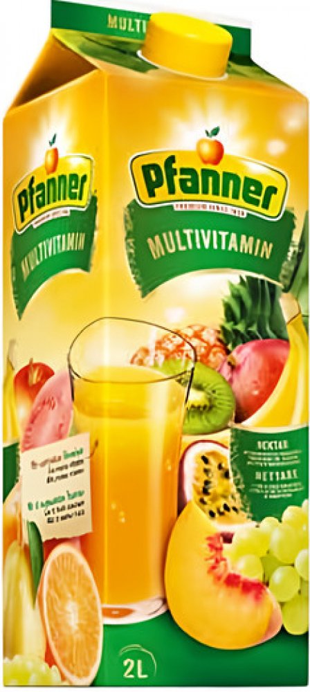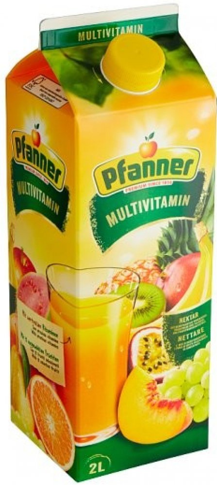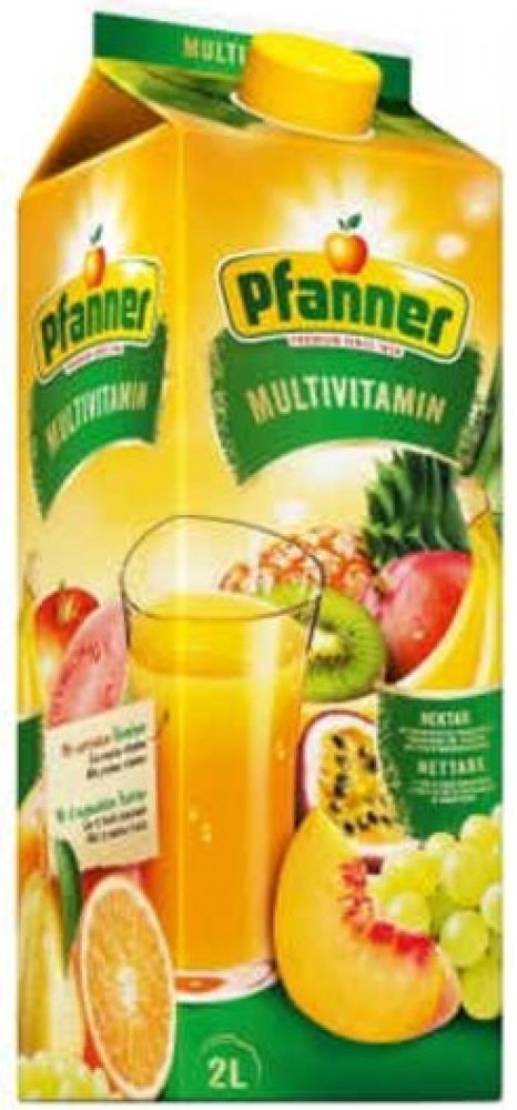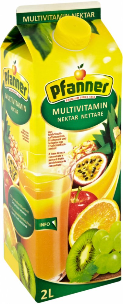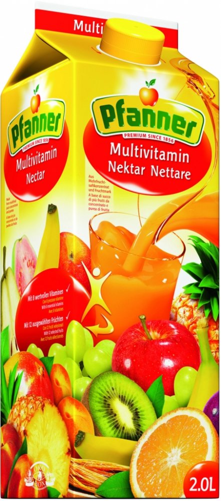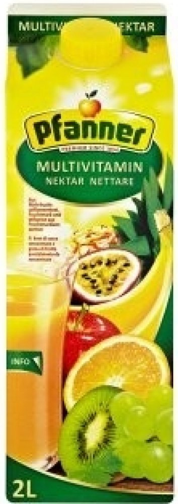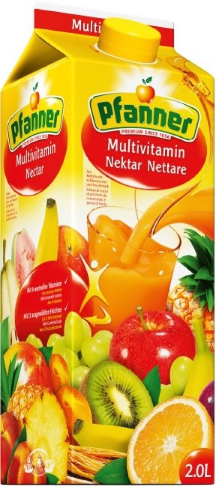 Multivitaminový nektar z několika druhů ovoce, vyrobený z ovocného koncentrátu, a ovocné dřeně zčásti z koncentrátu. Pasterováno.