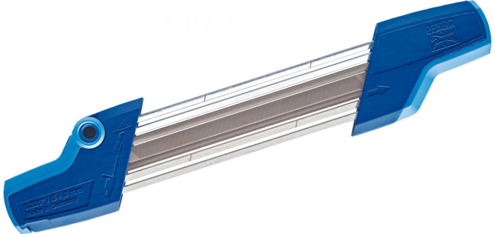 Vodítko Chain Sharp CS-X 4,8mm (11098048) pro ruční broušení řetězů s dělením .325". Jeho velkou výhodou je současné broušení řezných zubů a omezovačů hloubky během jedné pracovní operace což automaticky zajišťuje přesné dodržení vzdálenosti mezi horní hranou zubu a omezovačem hloubky.změna z levého na pravý zub bez změny nastavenísprávná velikost pilníku je vždy po ruce a pilníky se snadno vyměňují ze strany pomocí bočního otvorujasné symboly ukazují správný způsob použití vodítkaDodávka se skládá z:vodítkaplochého pilníkudvou kulatých pilníkůPrůměr 4,8mm se používá pro .325" řetězy (nové a málo opotřebené) např.:Carlton K1L, K2L, K3L, K1C, K2C, K3CSTIHL 3639, 3638, 3686, 3685Oregon 20LPX, 21LPX, 22LPX, 20BPX, 21BPX, 22BPX