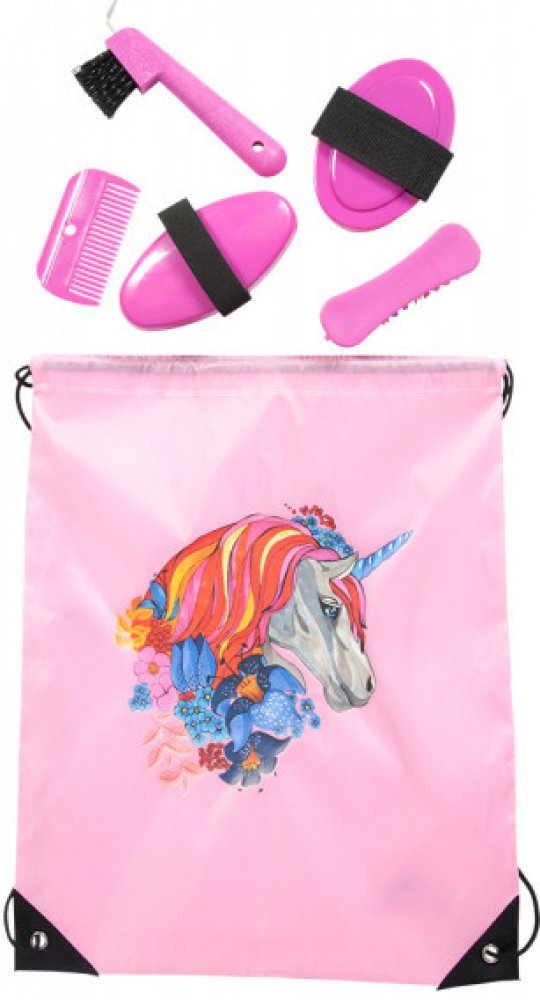 Sada obsahuje Jemýá kartáč s poutkem, malý jemný kartáč na hlavu koně, gumové hřbílko, kopytní háček a palstový hřeben na hřívu.