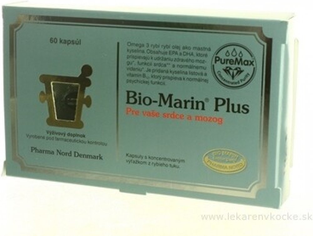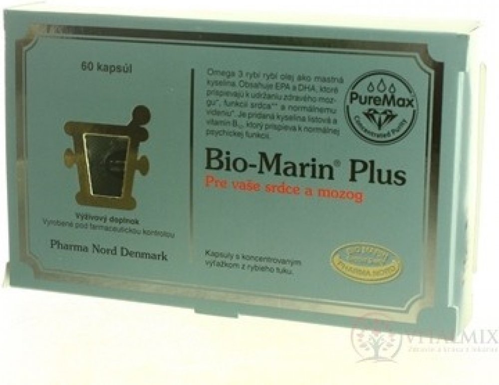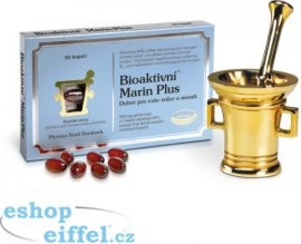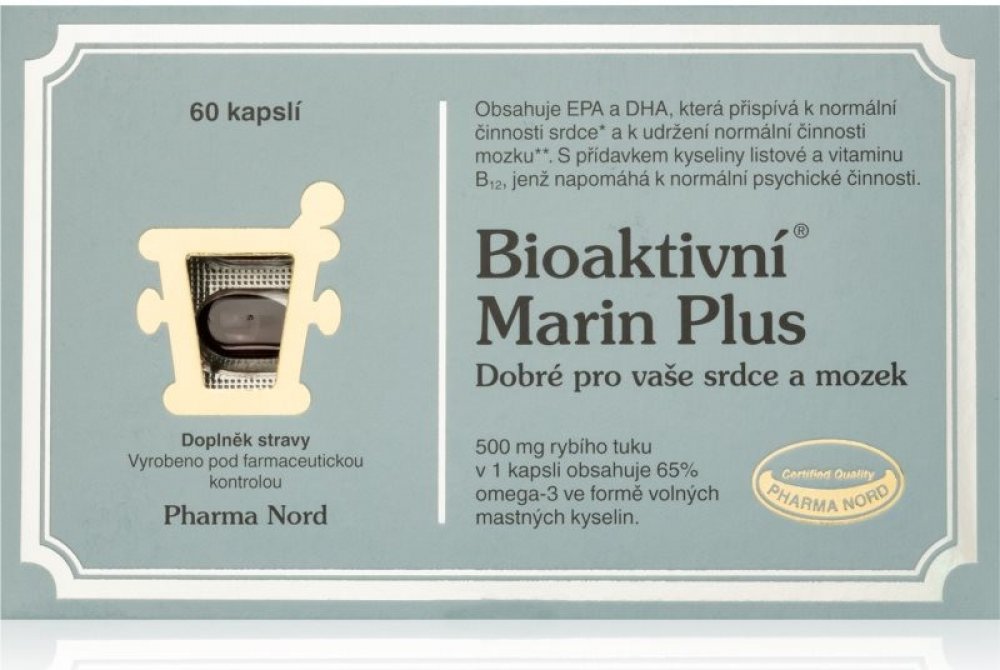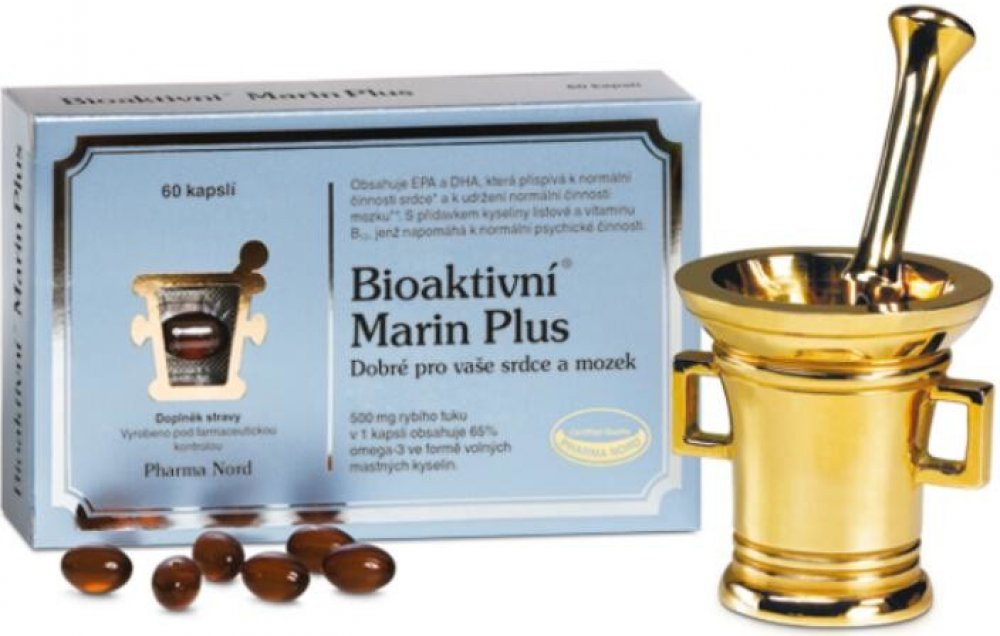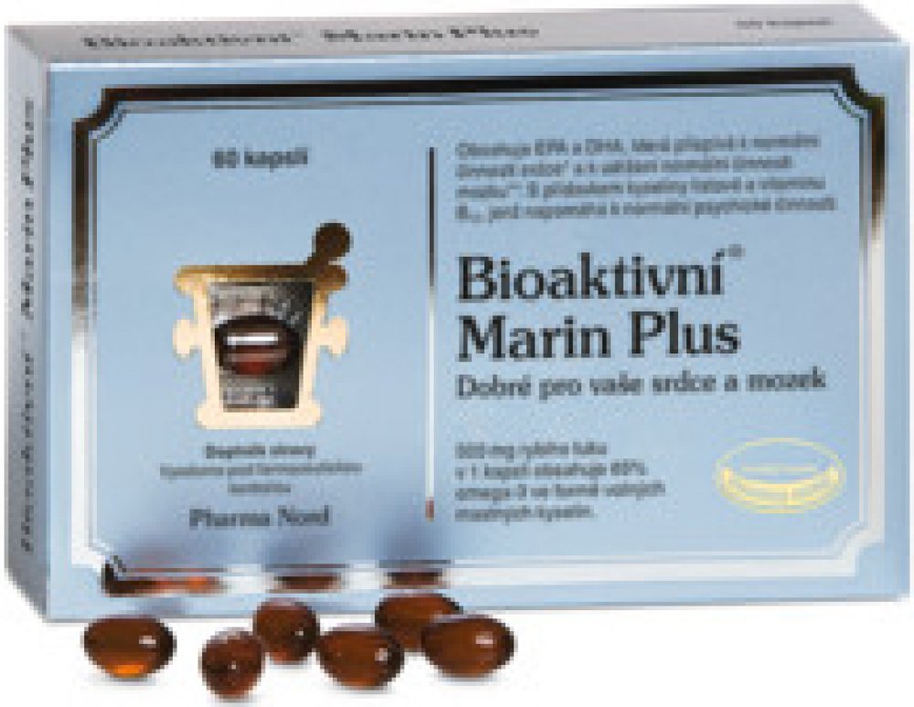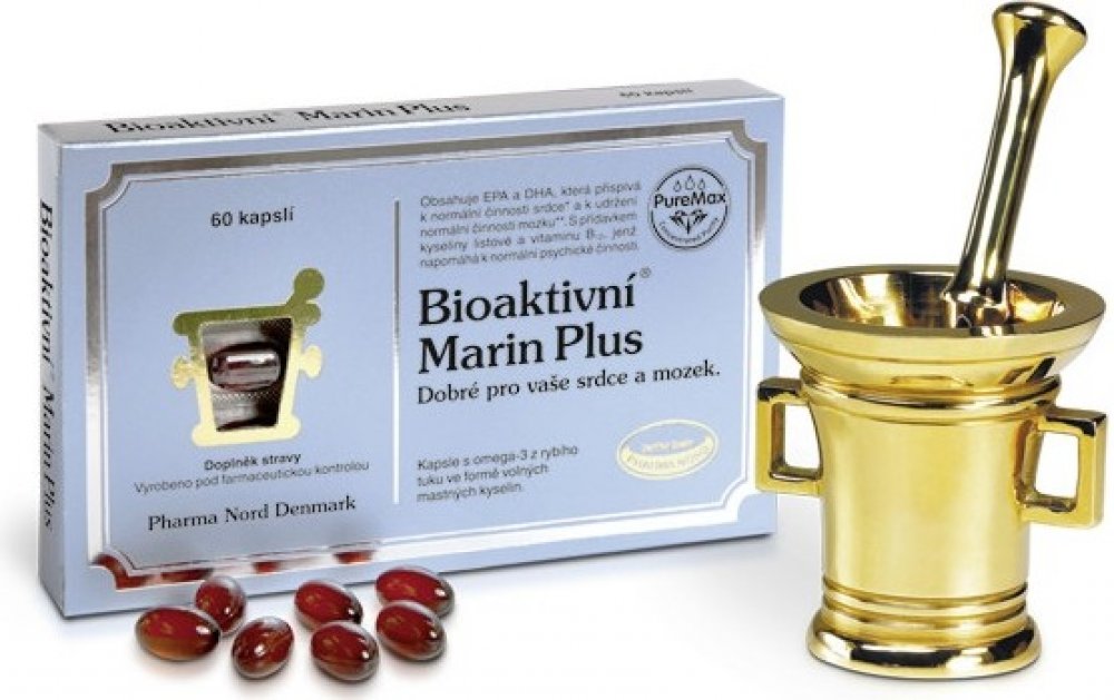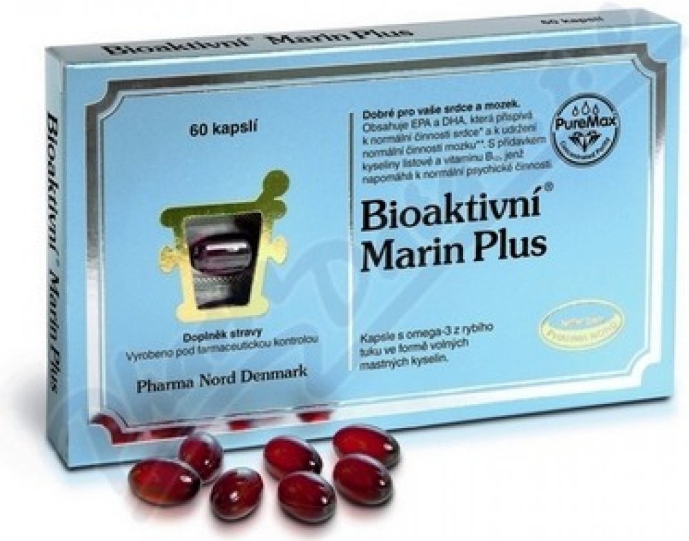 Bioaktivní Marin Plus je čistý, koncentrovaný a obohacený rybí tuk. S volnými mastnými kyselinami, které mají o 50 % lepší vstřebatelnost. Koncentrovaný výtažek z rybího tuku obsahující 65 % omega-3 mastných kyselin. Kombinován s vitaminem B12 a kyselinou listovou, která podporuje normální metabolizmus homocysteinu. Výtažek z rybího tuku je důkladně vyčištěn od pesticidů, těžkých kovů, dioxinů a dalších toxických látek. Přípravek s rybím tukem, který splňuje a dokonce i překračuje všechny regulační požadavky EU týkající se čistoty preparátu.