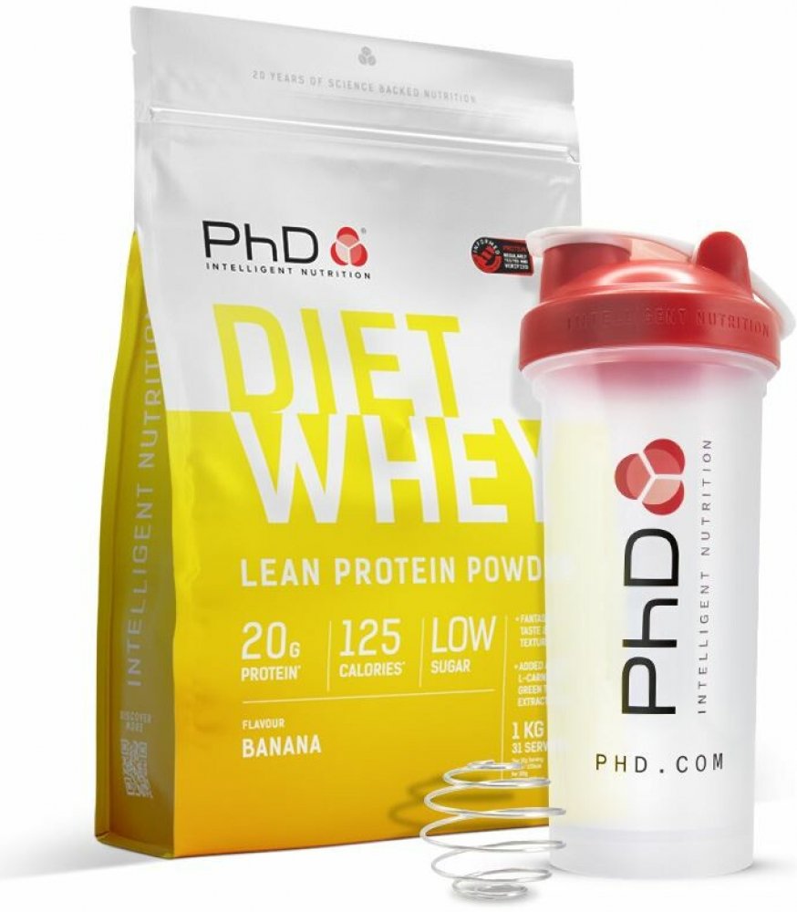 Dávkování: Užívejte 32 g 1 x denně (před tréninkem, po tréninku nebo kdykoliv během dne). 1 dávku připravíte smícháním 32 g (1 odměrka prášku) s 200 ml vychlazené vody v šejkru nebo mixéru, protřepávejte po dobu 10 sekund. PhD Diet Whey můžete také přidávat do jogurtu nebo do svých oblíbených snídaňových cereálií nebo ovesné kaše. Upozornění: Ukládejte mimo dosah dětí. Nepřekračujte doporučenou denní dávku. Skladujte na suchém a chladném místě. Není náhrada pestré stravy a zdravého životního stylu. Může obsahovat stopy vajec a lepku. Neužívejte 800 mg epigallokatechin- 3-gallátu nebo více za den. Produkt byste neměli konzumovat, pokud tentýž den konzumujete jiné výrobky, které obsahují zelený čaj. Produkt nekonzumujte nalačno. Nevhodné pro těhotné, kojící a děti do 18 let. Výživové údaje: 100 g 1 dávka* (32 g) Energetická hodnota 1636 kJ / 392 kcal 524 kJ / 125 kcal Tuky 8,1 g 2,6 g Z toho nasycené mastné kyseliny 4,1 g 1,3 g Sacharidy 11 g 3,6 g Z toho cukry 2,6 g 0,8 g Vláknina 3,6 g 1,1 g Bílkoviny 65 g 20 g Sůl 0,85 g 0,27 g Další aktivní látky: ve 100 g 1 dávka* 32 g Konjugovaná kyselina linolová 1085 mg 347 mg Acetyl L-karnitin 848 mg 271 mg Extrakt ze zeleného čaje 400 mg 128 mg z toho polyfenoly 160 mg 51 mgn z toho katechiny 80 mg 26 mg z toho kofein 32 mg 10 mg z toho EGCG (epigalokatechingalát) 28 mg 9 mg *1 dávka odpovídá 32 g (1 odměrka). Balení obsahuje 31 dávek. Výrobek není balen na počet dávek, ale na hmotnost. Složení příchuť banán: PhD prémium bílkovinná směs [syrovátkový bílkovinný koncentrát 81 % (obsahuje emulgátor lecitin), sójový bílkovinný izolát, mléčný bílkovinný koncentrát)], waxy ječná mouka, moučka z lněného semínka zahušťovadla (arabská guma, guarová guma, xanthanová guma), aroma, konjugovaná kyselina linolová (CLA) prášek [olej z Světlice barvířské (bohatý na CLA); alergen mléko], acetyl L-karnitin, zelený čaj extrakt (Camellia sinensis), sladidlo sukralóza.