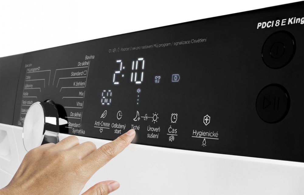 Kondenzační sušička s tepelným čerpadlem Philco PDCI8E King, v energetické třídě A+++, je určená pro sušení 8 kg prádla. Tato senzoricky řízená, svého druhu jedna z nejúspornějších sušiček na trhu, je vybavena Invertorovým motorem s 10letou zárukou, funkcí Hygienické pro vyšší sterilitu prádla, nebo možností připojit sušičku na odpad vody. Funkce na snížení pomačkání prádla AntiCrease, program Můj program, který umožňuje trvalé uložení nejčastěji používaného programu s Vámi předdefinovanými parametry. Pro věžové uspořádání této sušičky s pračkou řady King lze použít mezikus KIT 59, pro šetrné sušení vlny držák PDH 8.