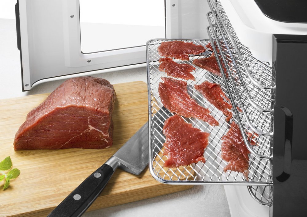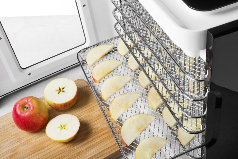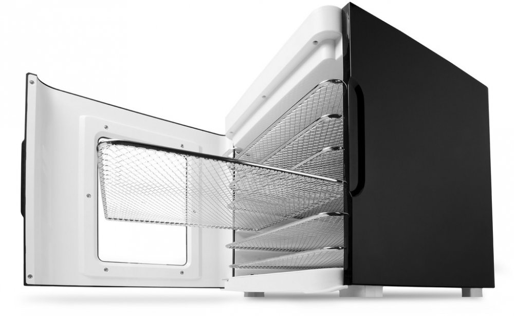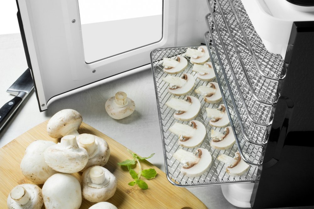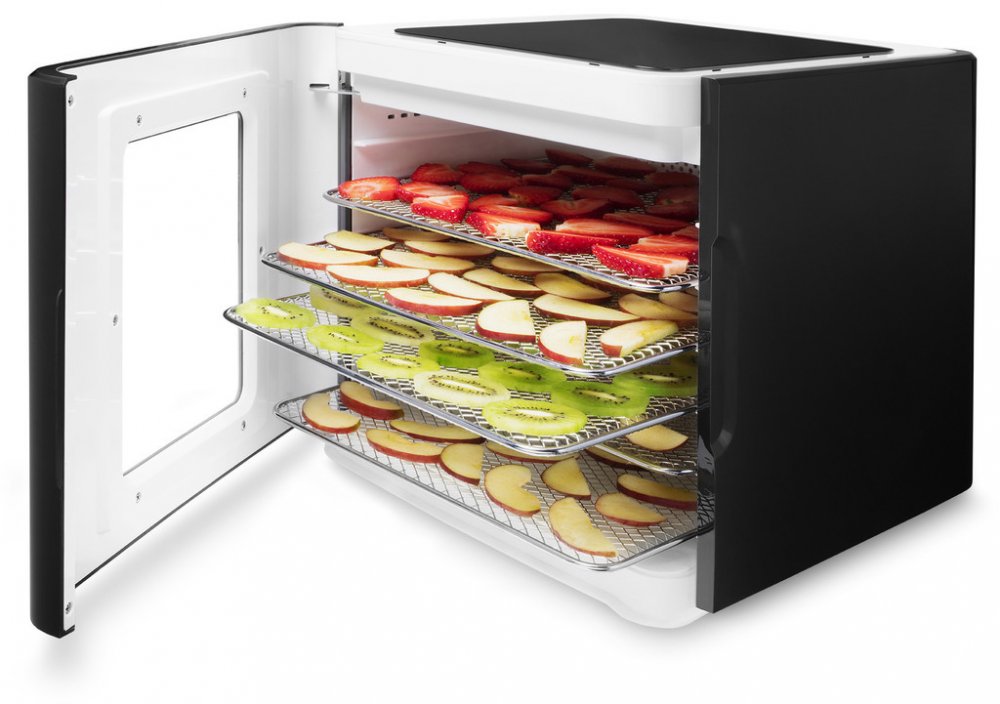 6 nerezových plat o velikosti 30x25 cm zajistí dostatečný prostor pro vaše sušení. Součástí sušičky je pak i vyjímatelný tácek na zbytkovou vodu a případný nepořádek, který vznikne na dně během sušení. Je jednoduché jej vyjmout, umýt a opět umístit pro další várku.