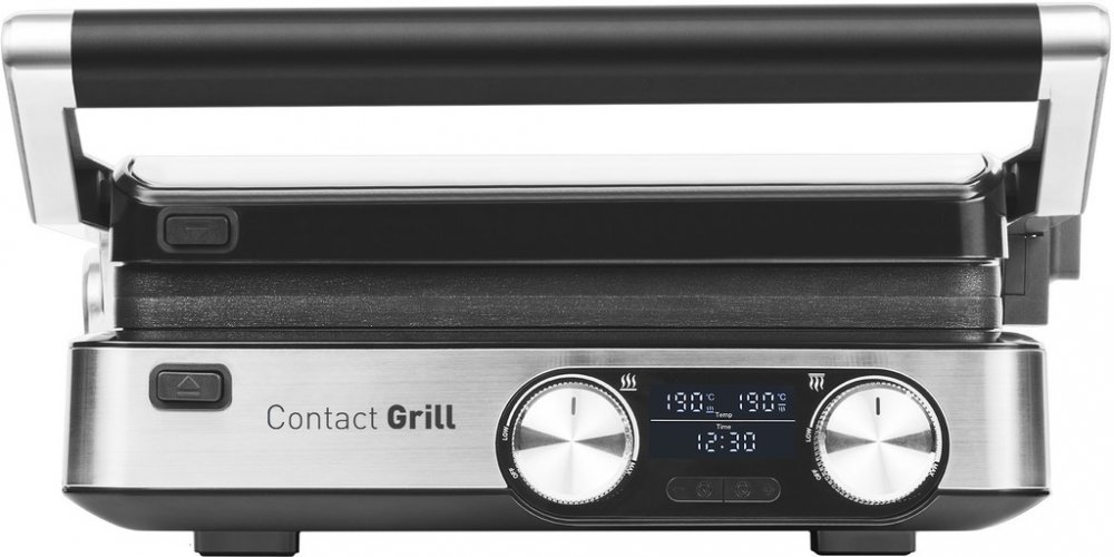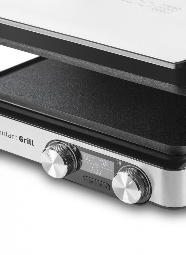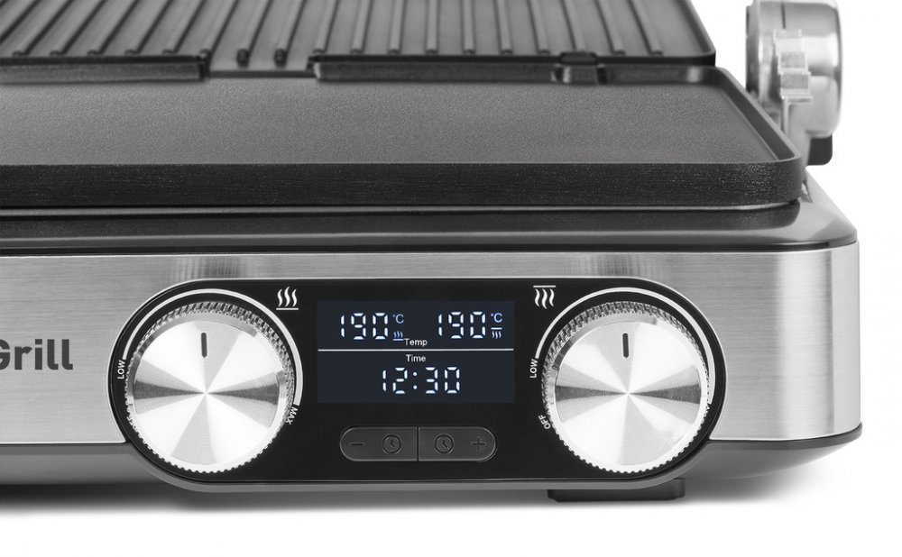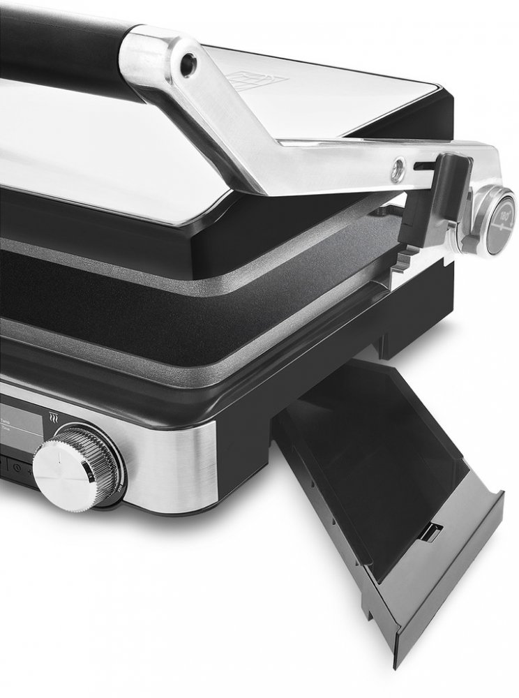 Na grilu oceníte i jeho vizuální stránku. Gril je vyroben v nerezovém designu a má dominantní ovládací panel s LED digitálním displejem. Mezi další vychytávky grilu patří pevné nastavení výšky horní grilovací desky, díky čemuž nerozmačkáte měkké potraviny, nebo výsuvný odkapávací tácek, který se vysouvá velmi prakticky na boku spotřebiče.