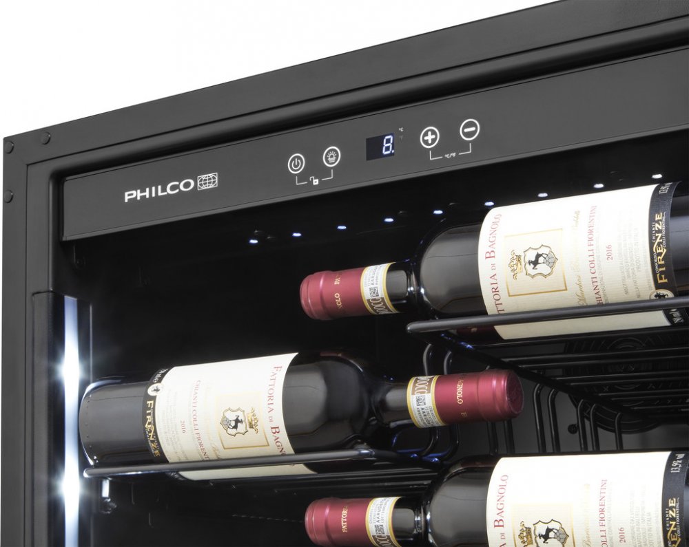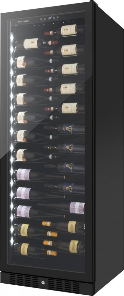 Jednozónová, kompresorová, senzorově ovládaná, vinotéka Philco PW143GLV na 143 lahví, s Label View uspořádáním na teleskopických výsuvných kovových policích se Softclose, díky kterému vidíte kde, které víno máte uložené a to bez otevření dveří. Vinotéka je opatřena trojitým sklem dveří s UV ochranou a speciálně uloženým kompresorem pro snížení vibrací. Dveře vinotéky jsou opatřeny zámkem.