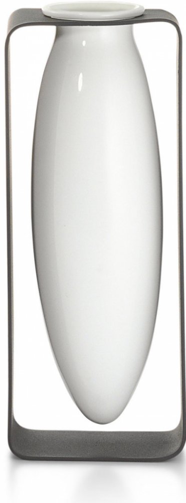 Váza je vyrobena z bílé keramiky a rám této vázy je vyroben z lakované oceli v šedé barvě. Má malý otvor a je určený pro jednotlivé květiny nebo malé kytice. Váza bude vypadat skvěle v každém interiéru, ale vynikne zejména v moderním interiéru.