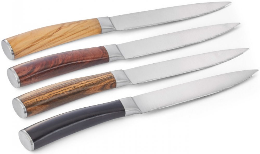 GARRY je sada steakových nožů s rukojeťmi z pravého dřeva v kvalitní dárkové krabičce, která má nadčasový design v kombinaci s elegantním vzhledem. Čtyři elegantně zakřivené, extra ostré nože zaujmou různými rukojeťmi z hnědého a černohnědého ebenu, červenohnědého palisandru a světlého olivového dřeva.
