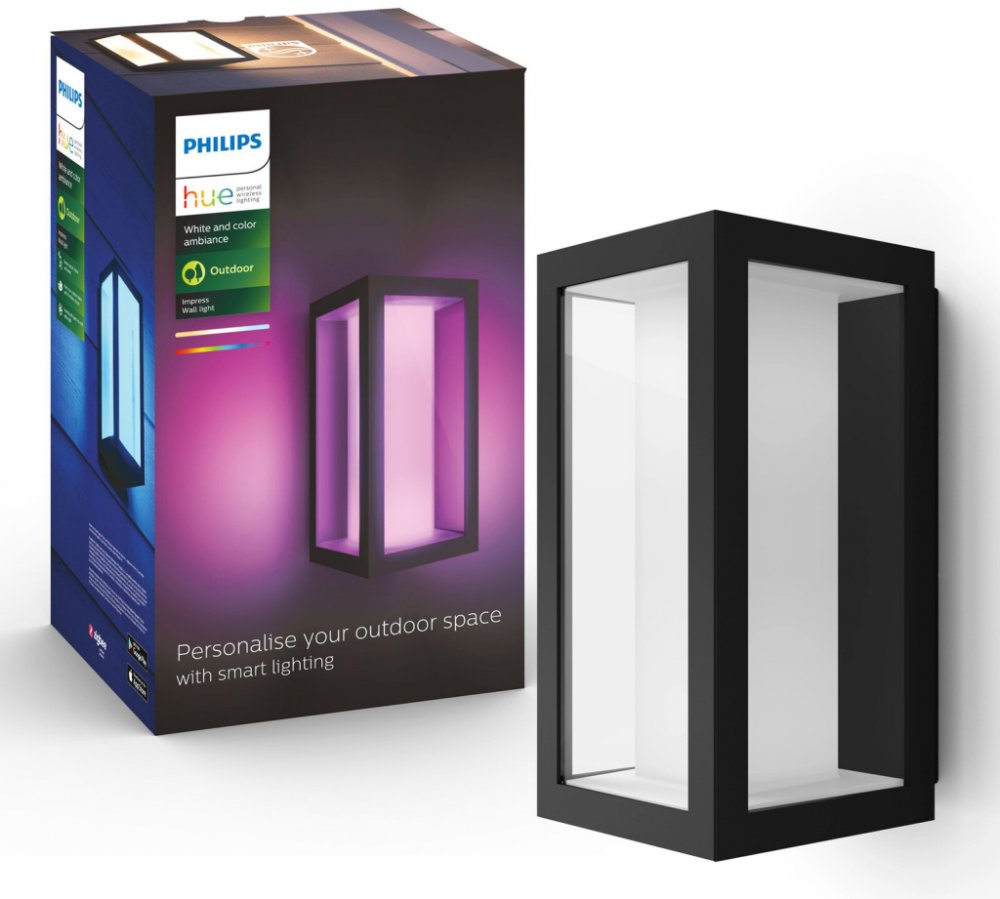 Světlo a barva do zahrady - venkovní nástěnné světlo Philips Hue White and Color Ambiance Impress Úzká nástěnná lampa Impress LED pro venkovní použití je ideální pro vstupní prostory, fasády nebo terasy. Nejen svítí, ale moderní technologie založená na ZigBee umožňuje inovativní, chytré a inteligentní ovládání správné aplikace. Po propojení s interním systémem Philips Hue lze venkovní světlo Impress přepínat, stmívat a také časovat pomocí aplikace Hue. Nastavení barev integrovaných LED se pohybuje od spektra teplé bílé po denní světlo. Je také možné zvolit si barevný odstín z přibližně 16 milionů barev: ať už červené, zelené nebo modré - zde prakticky neexistují žádná omezení pro váš vlastní světelný design. Kompatibilní s Philips Sync, venkovní světlo lze instalovat na terasu, například večer může svítit ve světle hudby a poskytovat dlouhé, příjemné večery venku. Technické údaje / kompatibilita: - ovladatelné a stmívatelné pomocí aplikace Hue - teplé bílé (2 000 K) až denní světlo (6 500 K) - 16 milionů barev pro působivé venkovní osvětlení - kompatibilní se stávajícím systémem Philips Hue - Možnost hlasového ovládání s Amazon Alexa, Apple HomeKit a Google Assistant - propojitelný s detektorem pohybu Hue Outdoor Sensor (viz příslušenství) - kompatibilní s Hue Sync - Light v souladu s hudbou - Je nutné se připojit k Hue Bridge (viz příslušenství) Upozornění: Pro správnou funkci venkovního osvětlení Hue by první venkovní svítidlo mělo být max. 10 m od vnitřního Bridge nebo Hue světla. Poté všechna ostatní světla ve vzdálenosti max. 20 m k instalaci. Čím nižší je vzdálenost, tím lepší.