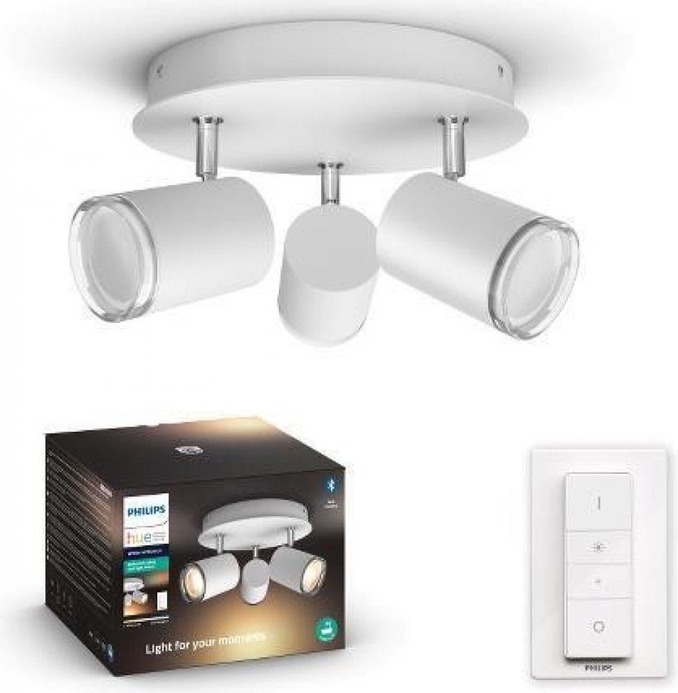Stropní bodové svítidlo včetně LED žárovky GU10, 3 světelné body, White Ambiance. Vhodné do koupelny, IP44. Ovládání přes aplikaci Hue Bluetooth nebo přiloženým stmívačem. Vhodné pro připojení k Hue Bridge. Funguje s Amazon Alexa či Google Assistant. Bílé světlo v širokém spektru odstínů. Možnost stmívání. 4 světelná schémata. Životnost až 15 000 h.