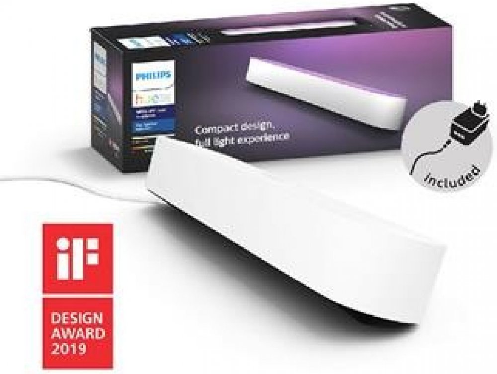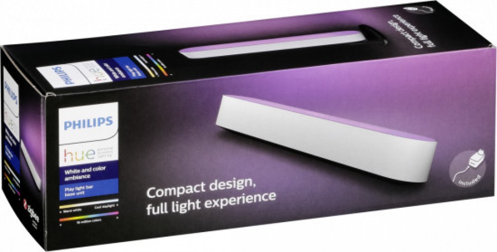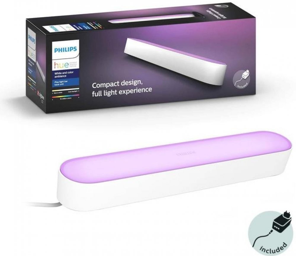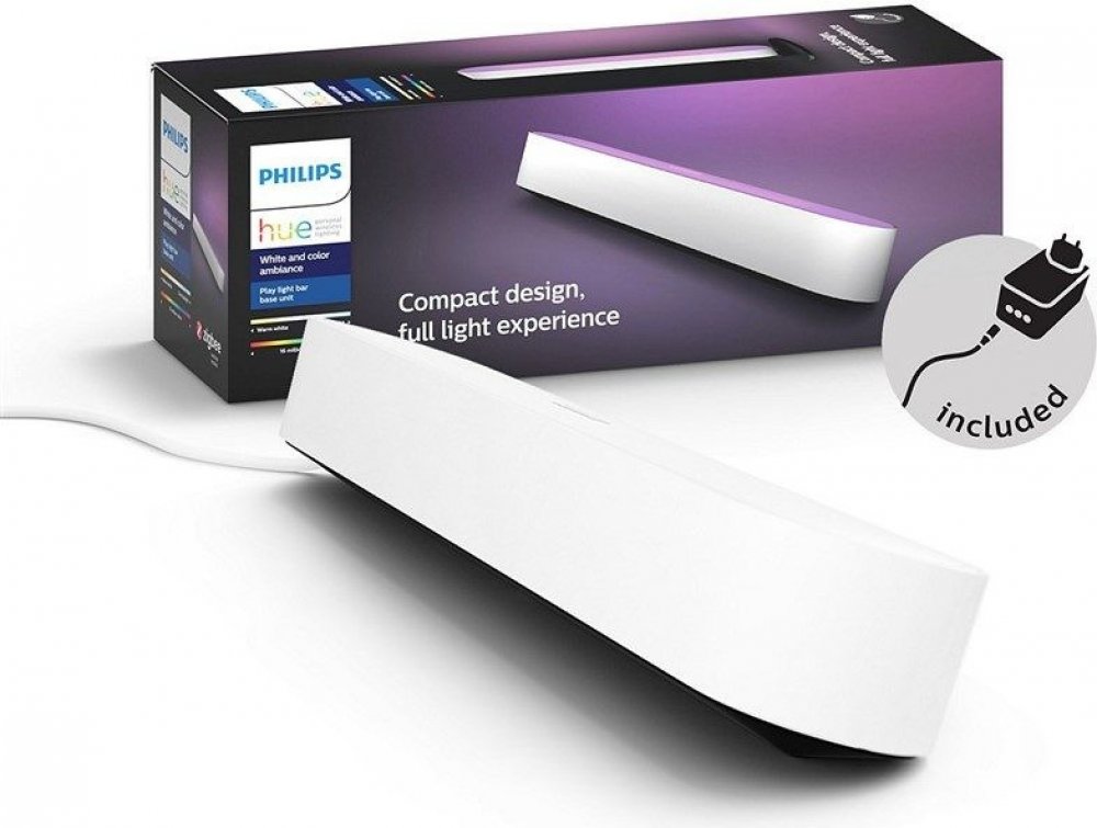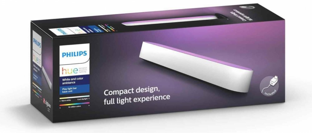 Základní sada obsahuje - 1x Hue Play s 2m kabelem, 1x napájecí jednotka, 2x stojánek, 2x clip na TV, lepící páska a instalační materiál.