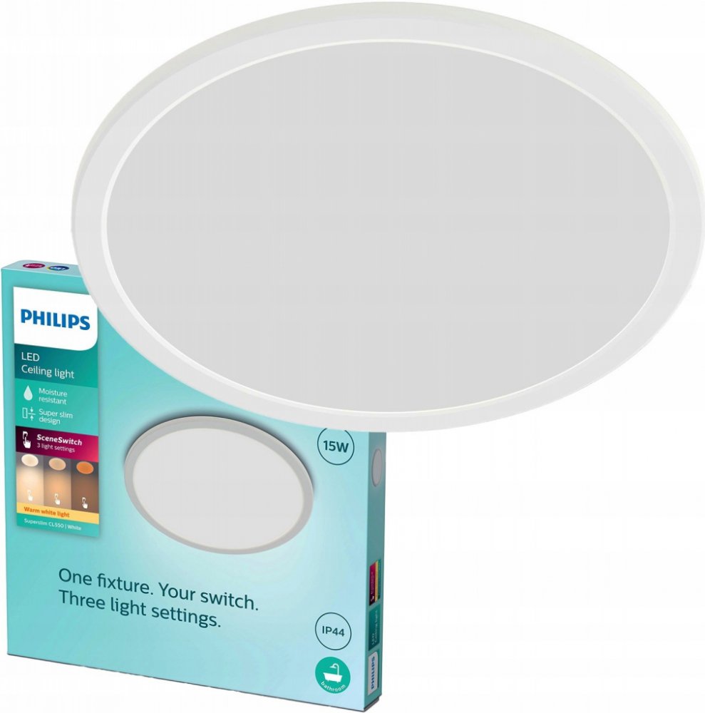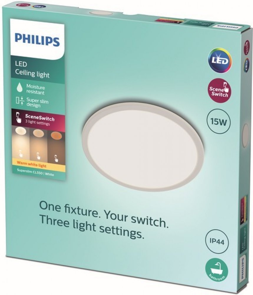 Stropní svítidlo Superslim CL550 z kolekce funkčního osvětlení značky Philips v menší variantě o průměru 25 cm je určeno pro přisazenou montáž do interiéru s krytím IP44, které je vhodné do koupelen a místností s výskytem vyšší vlhkosti vzduchu. Toto svítidlo je vybaveno funkcí SceneSwitch, která nabízí tři úrovně jasu teplé žluté barvy světla s teplotou chromatičnosti 2700K. Není potřeba žádný stmívač, svítidlo krokově stmíváte nástěnným vypínačem. Zároveň Vám svítidlo poskytne kvalitní osvětlení, které šetří Vaše oči díky technologii EyeComfort. Stropnice má štíhlý design a je vhodná pro nízké stropy. Není třeba složitá instalace. Celkové rozměry činí 2,3 x 25 x 25 cm. Kulatá základna je zhotovena z kvalitního kovu s bílou povrchovou úpravou, kterou doplňuje bílý plastový difuzor s integrovaným LED zdrojem o příkonu 1 x 15 W se svítivostí až 1300lm a životností dosahující až 20 000 hodin. Index podání barev je vyšší a roven hodnotě 80. Stropnice je napájena ze sítě na 220-240V a vztahuje se na ni prodloužená záruka 5 let.
