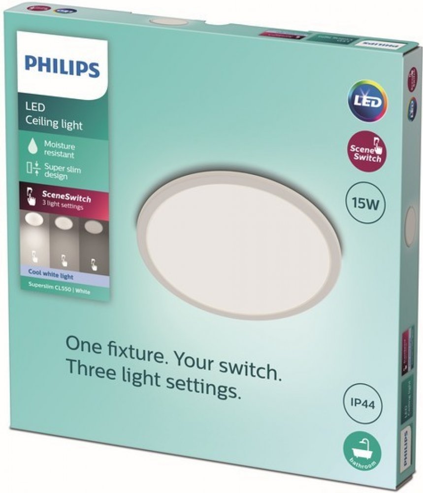 Měkký a jednoduchý tvar tohoto stropního svítidla LED 15W PHILIPS CL550 SuperSlim IP44 Stmívatelné 3 úrovně je decentní a diskrétní a hodí se do každé místnosti.Technologie LED integrovaná v tomto svítidle Philips je řešením vyvinutým výhradně společností Philips. Ihned po zapnutí poskytuje optimální světelný výkon a přináší do vašeho domova živé barvy.Světlo může mít různé teploty barev, které se vyjadřují v jednotce zvané Kelvin (K). Žárovky s nízkou hodnotou Kelvina vytvářejí teplé, útulné světlo, zatímco žárovky s vyšší hodnotou Kelvina vytvářejí chladnější, energeticky bohaté světlo. Tato žárovka Philips poskytuje chladné, bílé světlo, které vám dodá energii.Tato úsporná stropní LED žárovka Philips šetří energii v porovnání s tradičními zdroji světla, čímž vám ušetří peníze na účtech za elektřinu a pomáhá životnímu prostředí.Funguje s vaším stávajícím vypínačem světla. Někdy můžete chtít upravit atmosféru tak, aby vyhovovala vašim činnostem. S tímto stropním LED svítidlem Philips SceneSwitch můžete snadno měnit nastavení světla pomocí stávajícího vypínače. Není potřeba žádný stmívač ani další instalace.Referenční údaje: Stropní svítidlo s osvětlením, které se používá v interiéru, je vybaveno systémem osvětlení:929002667601 VÝŠKA: 2,3 cmŠÍŘKA: 25 cmDÉLKA: 25 cm Philips Superslim CL550 SS RD 15W 40K W 8719514327221 / 8719514327221 - Technické údaje Typ výrobku:Světlo Zdroj světla: Není požadováno Max. Příkon: 0 W
